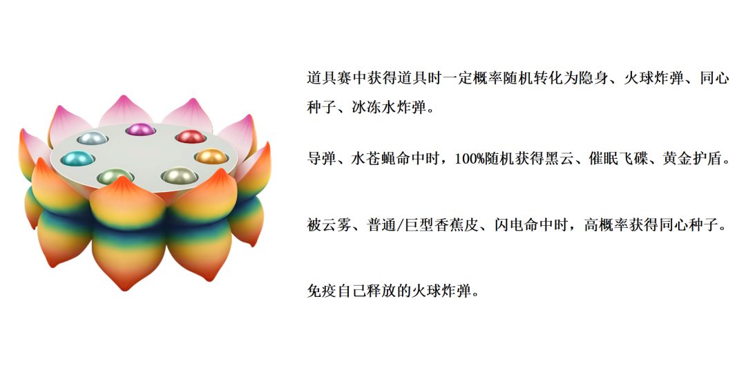 道具赛中获得道具时一定概率随机转化为隐身、火球炸弹、同心种子、冰冻水炸弹。