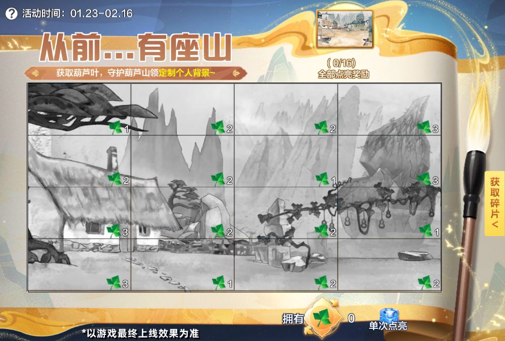 从前有座山,山上有个屋,屋边一条葫芦藤…耳熟能详的故事是否勾起了车友们的儿时回忆呢?1月23日-2月16日,福利站将开启【从前...有座山】福利活动。完成指定任务可获取葫芦叶,使用葫芦叶点亮拼图,可解锁单次点亮宝箱,拆开可随机获得奖励,点亮拼图中的所有格子,即可领取葫芦兄弟联名专属个人背景!