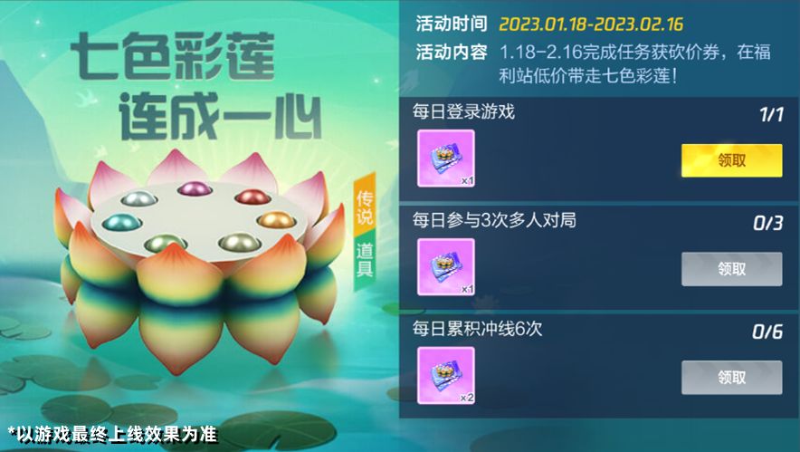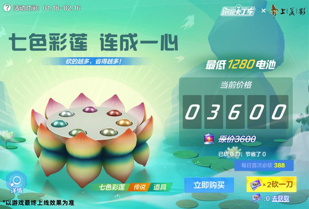 1月18日起活动中心将开启【七色彩莲】任务送砍价券活动。活动期间完成指定任务可收集七色彩莲砍价券,用于在福利站参与七色彩莲砍价活动,最低仅需1280电池即可购买传说道具赛车【七色彩莲】,车友们不要错过哦~