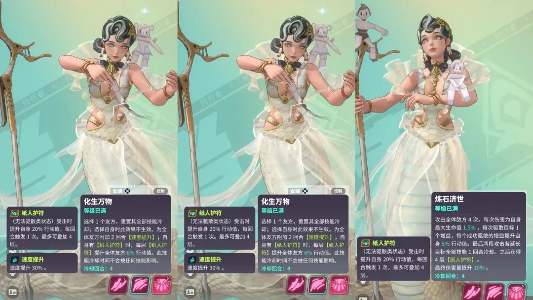 队长技能全体增加40%命中风女希1技能[抟土作人]根据自身最大生命值对敌方单体造成伤害,降低目标行动值。每层[纸人护符]使此技能额外攻击1个目标。之后获得1层[纸人护符]风女希2技能[化生万物]选择1个友方,重置其全部技能冷却;选择自身时此效果不生效。为全体友方附加[速度提升]效果;自身有[纸人护符]时,每层[纸人护符]提升全体友方的行动值。此技能冷却时间不会被任何技能影响。风女希3技能[炼石济世]根据自身最大生命值多次攻击敌方全体目标,每次驱散目标增益状态。最后两段攻击各延长目标技能冷却时间。之后获得4层[纸人护符]。[觉醒] :根据自身最大生命值多次攻击敌方全体目标,每次驱散目标增益状态,每个成功驱散的增益提升自身行动值。最后两段攻击各延长目标技能冷却时间。之后获得[纸人护符]。[纸人护符] : (无法驱散类状态) 受击时消耗1层此状态,提升自身的行动值,每回合触发1次。最多可叠加4层。共鸣1阶:技能[炼石济世]造成的最终伤害量提升10%。2阶:技能[抟土作人]新增效果:自身有[纸人护符]时先偷取目标1 个增益。3阶:基础攻击、基础防御、基础生命值提升15%。4阶:攻击时有20%概率无视抵抗。(S3是全体多段,多段配合概率无视抵抗,且自身是闪耀属性,啧啧)5阶:基础攻击、基础防御、基础生命值提升20%。6阶:技能[炼石济世]效果变化:受击时不再消耗[纸人护符]。获取方式:更新后可从黄金卡池中获取。新闪耀,女娲,前有女娲造人,现有游戏造神;普攻偷buff、2技能清队友cd全体拉条,3技能清对面buff自拉条加上给对面加cd;究极缝合怪而且还专门挑强的缝合,属于是单独拿出任何一个技能都很强的存在,而且看技能描述又是一个高生命的优秀面板,如果生命、速度面板不拉跨不瘸腿已经不能用超模来形容了,且2.4.6命皆为有效命座,肉眼可见的强。阿千说两句关于强度以外的话,这两个角色美术水平还是依然在线的,都挺好看的。