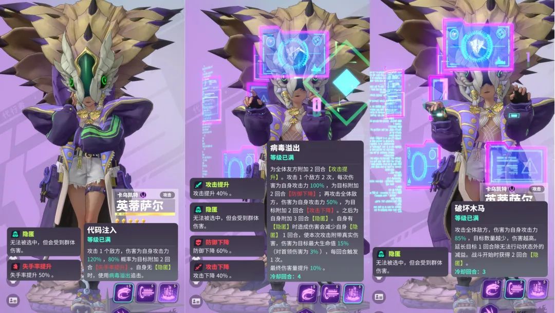 3技能[病毒溢出]根据自身攻击力对敌方单体造成多次伤害,为目标附加[防御下降] 效果;再根据自身攻击力对全体敌方造成伤害,为目标附加[攻击下降]效果。之后为自身附加[隐匿]。自身有[隐匿]时造成伤害会减少自身[隐匿]回合数,使本次攻击附带真实伤害,攻击时根据目标类型造成目标最大生命值一定百分比的伤害,每回合触发有最高上限。[觉醒] :为自身附加[攻击提升]效果。根据自身攻击力对敌方单体造成多次伤害,为目标附加[防御下降] 效果;再根据自身攻击力对全体敌方造成伤害,为目标附加[攻击下降]效果。之后为自身附加[隐匿]效果。自身有[隐匿]时造成伤害会减少自身[隐匿]回合数,使本次攻击附带真实伤害,攻击时根据目标类型造成目标最大生命值一定百分比的伤害,每回合触发有最高上限。共鸣1阶:技能[病毒溢出]造成的最终伤害量提升10%。2阶:技能[代码注入]新增效果:自身无[隐匿]时,使用病毒溢出追击。(S1后接S3这什么逆天东西)想起昨日杨戬测评的推文里面猜测,果真如此