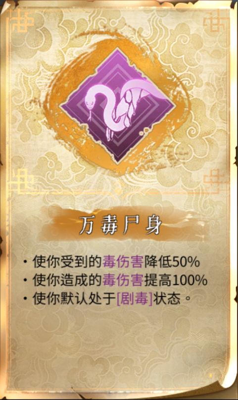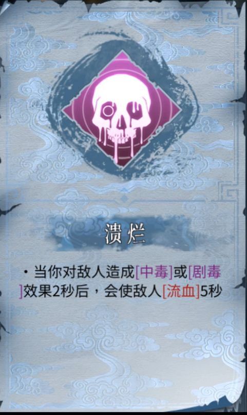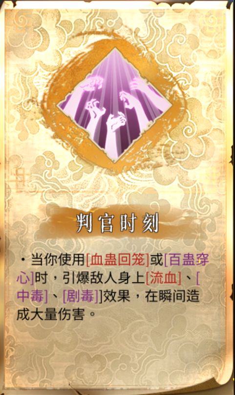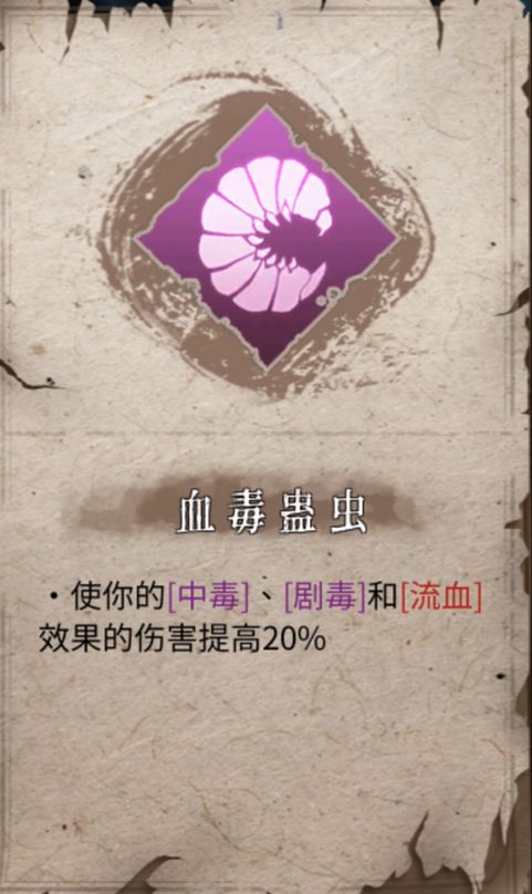 增加使敌人中毒的手段,配合万毒尸身的剧毒效果可以有效提高血溅的输出效率,加上判官时刻配合百足可以打出出色的效果,使用武器百足优先级可以再往上提