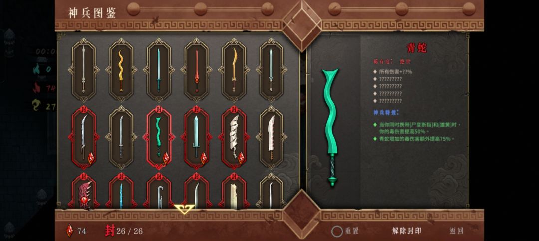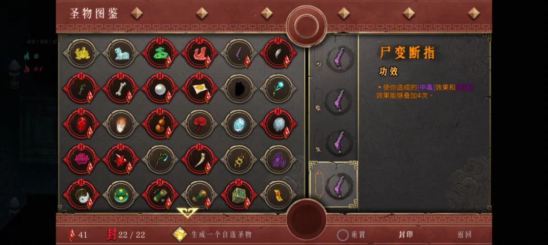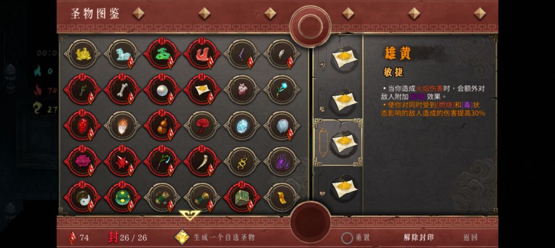 明明是纯毒伤的武器却需要雄黄这个必须额外带一个火属性圣物才能发挥作用的冷门圣物才能成型,这种设计无疑是大幅度限制了毒流派在纯毒伤build选择方面的多样性,尽管如此,最终还是围绕武器青蛇研究出了一套成型后可以稳秒白灰龙弟的毒伤build,具体搭配如下