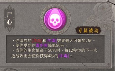 流血和中毒效果可叠加两层的效果就相当于一个低配版的断指4,这也是毒流派在毒伤方面所具备的天然优势,而容易让人费解的地方便在于尸心的第二第三词条,普攻会给自己叠上一层毒,听着有些迷惑,而这就需要配合血溅的专属被动来看了