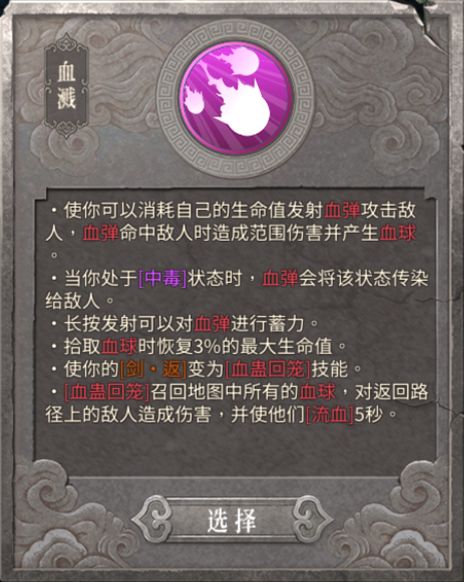 字非常多,让人看着就容易打瞌睡,总结一下就是将传统的飞剑替换成没有数量限制的血弹,通过尸心的被动给自己叠上一层毒,再通过血弹将自身的毒传递给敌人,其中中毒效果的伤害是受到通伤加成的,因此近战、飞剑、全伤、毒伤血溅都是可以拿的,机制有点绕,再加上血溅的血弹无法像醉歌一样可以进行长按连射,这在一定程度上拉高了血溅前期的操作难度,而关于血弹消耗生命这一点就值得说明一下,血弹消耗的生命值会随着自身血量的降低而降低,而拾起的血球回复的生命值则固定为百分之三,这就意味着血溅在低生命值时发射血弹的性价比变得极高,另外,由于通常情况下血溅基本无法维持在一个较高的血线,因此像怒不可遏和以下克上这种技能书在血溅身上都可以发挥出不错的效果,但是维持低血线的劣势就是容易暴毙,因此对自身血量的把控以及提高自身生存能力对血溅来说也是尤为关键的。![[嗒啦啦4_比心]](https://img.tapimg.com/market/images/d28961d9ef2d62e62333b8d17a8612dc.gif)