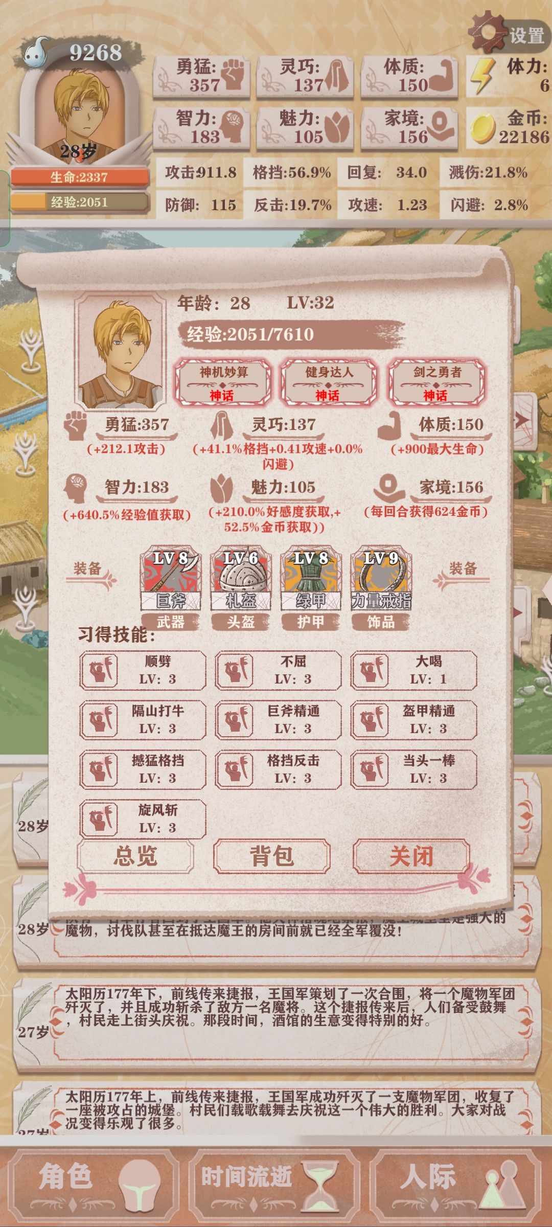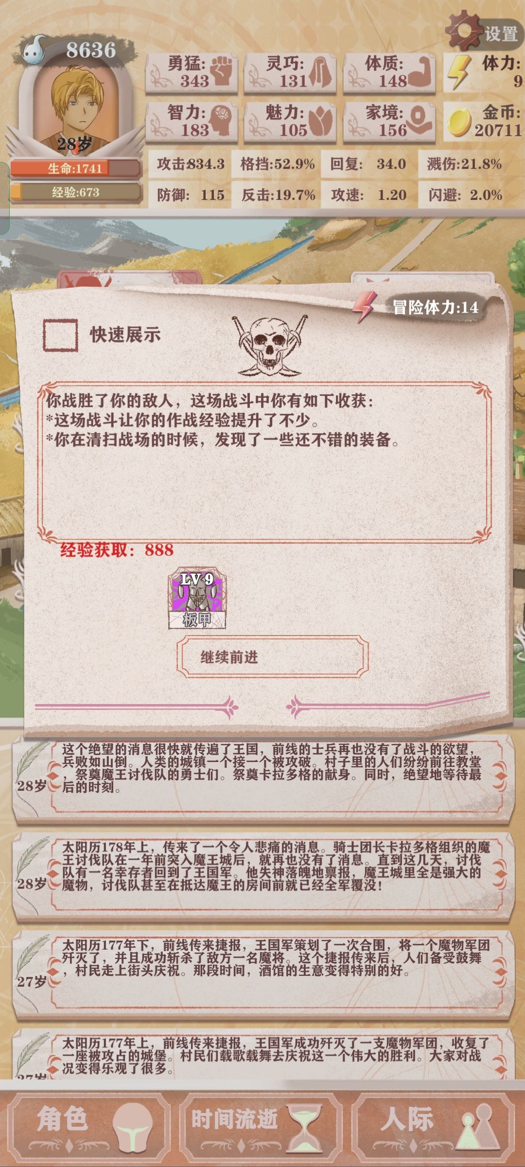 前期狂堆智力直到9岁,记得魅力跟上,不要忘记去玩耍,10岁后每天锻炼。前期冒险基本坐牢,拿神器,刷装备就行,见血快没了就撤 ,血量够就直接打boos,后期体质和灵巧有就买一次,智力和勇猛直接买满,打工也全做,堆黄金甲和匕首的加成,攻击直接拉满。