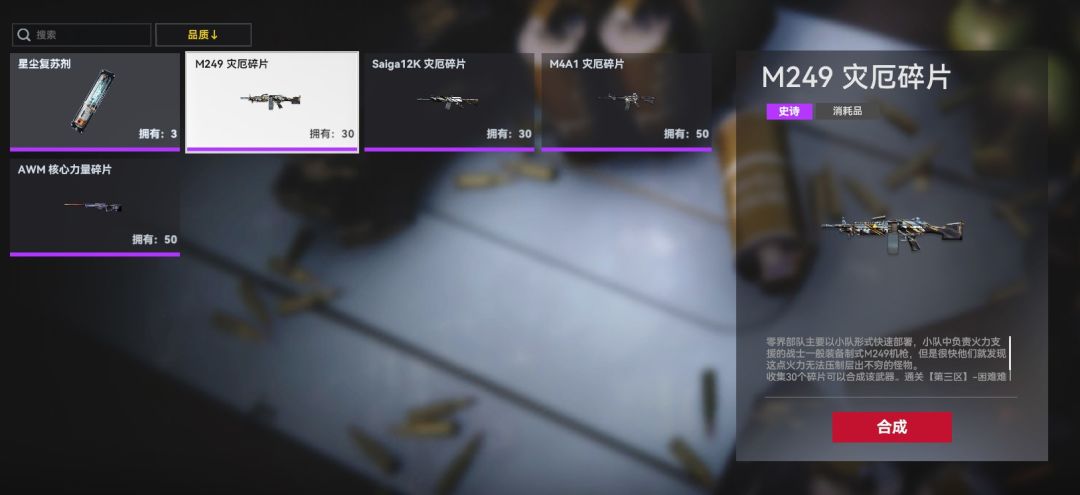 - 新增道具合成功能,各位玩家可以将【星耀无限】模式主线【第三区】获得的武器碎片进行合成