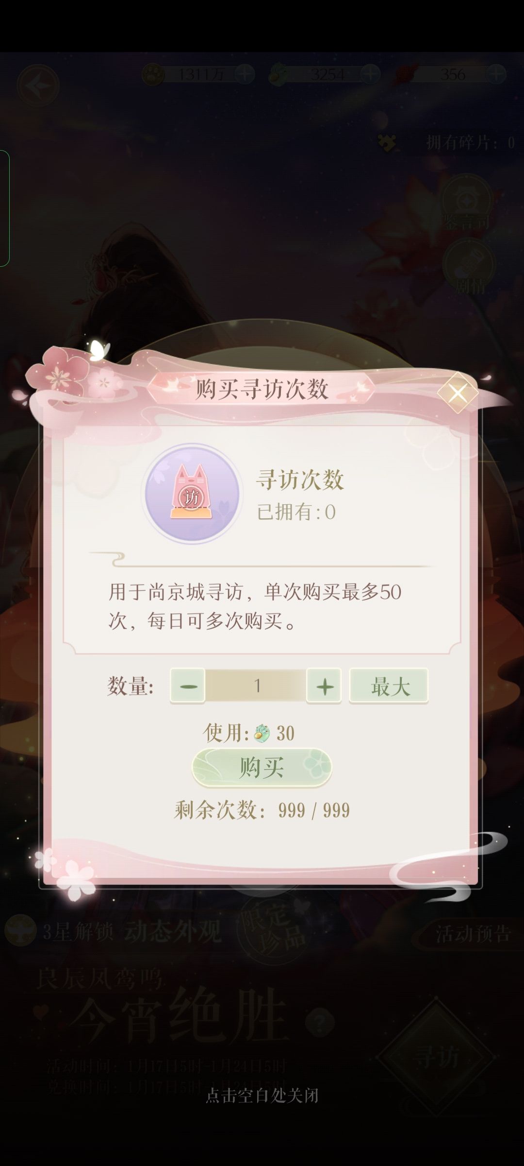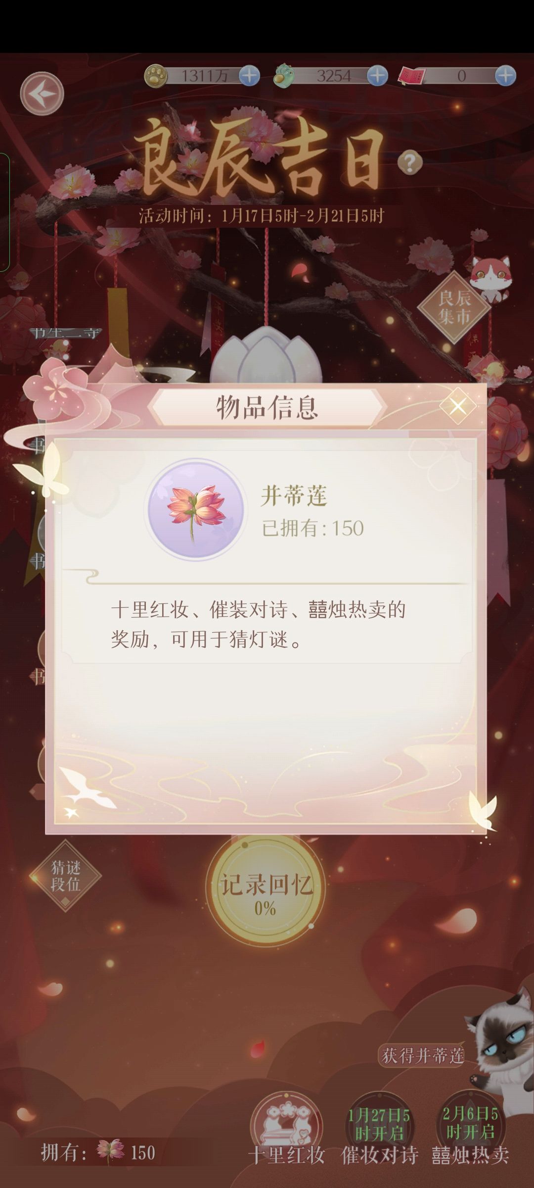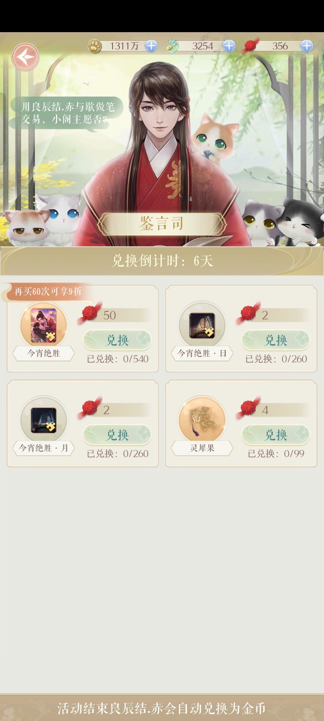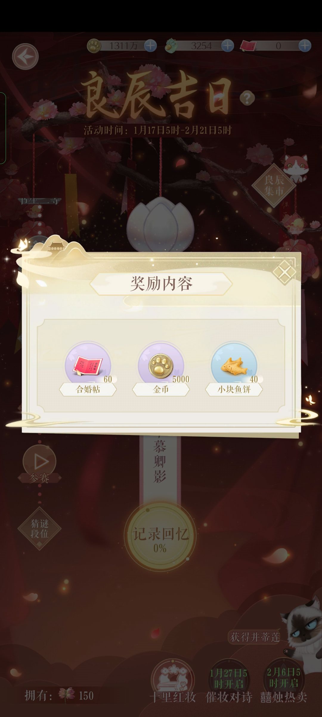 主活动的十里红妆次数尽可能拉满80次拿奖励,每天送6次,七天42次,余下次数需要花费15猫爪玉够买,花费570玉。