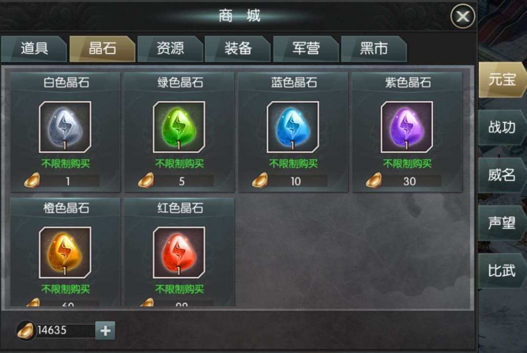 晶石的来源:【商城】→【元宝】→【晶石】