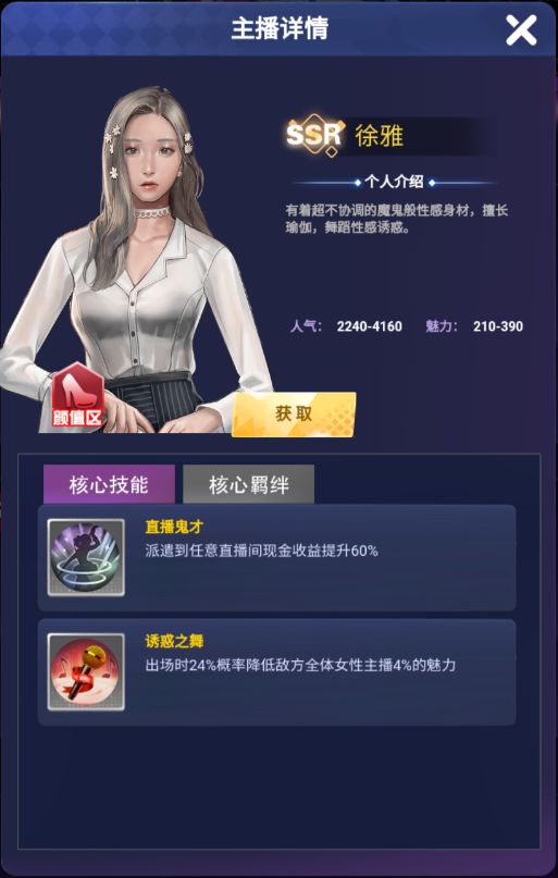 诱惑之舞:出场时24%概率降低敌方全体女性主播4%的魅力