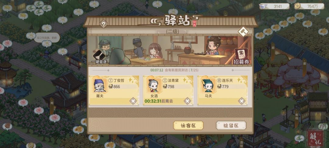 每隔半个小时驿站会随机刷新一位村民,当然也可以使用普通,特殊,和各职业招募劵快速刷新(招募卷获取方式会在下文补充),驿站分为访客区和驻留区,刷新的村民会出现在访客区,招募后可选择房屋入住,不选择入住或无合适住宅就会进入驻留区,房子住满后如果碰到高属性的优质村民可以选择招募到驻留区,作为生力军随时补充到村子。