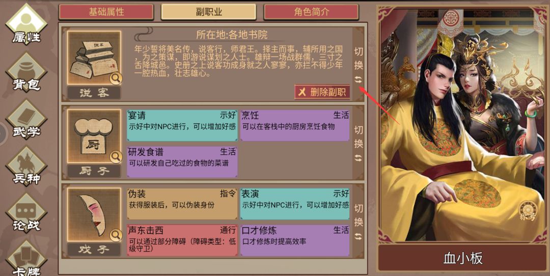 夜晚前往郊外触发阿飞剧情,获得游士推荐信,下回合清晨前往东城区隐市获取游士副职。