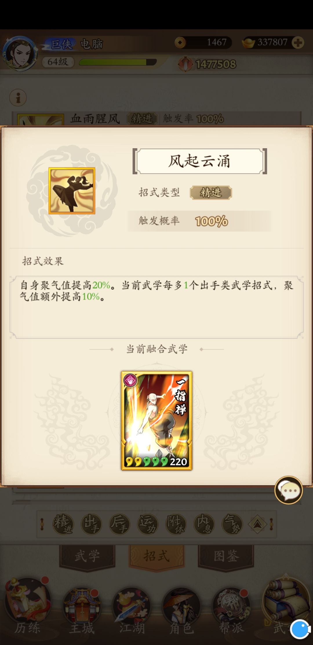 这里我个人建议是如鱼和凭虚御风都需要作为主运,这样有回春状态的情况下是稳定加成20%的聚气,另外就是风起云涌,我个人的建议是这个招式是个发动机,可以说是整个套路快速循环的启动器,所以一定要放在关键吸内技能的上面或者前面,让整个套路能够快速打出吸内效果。