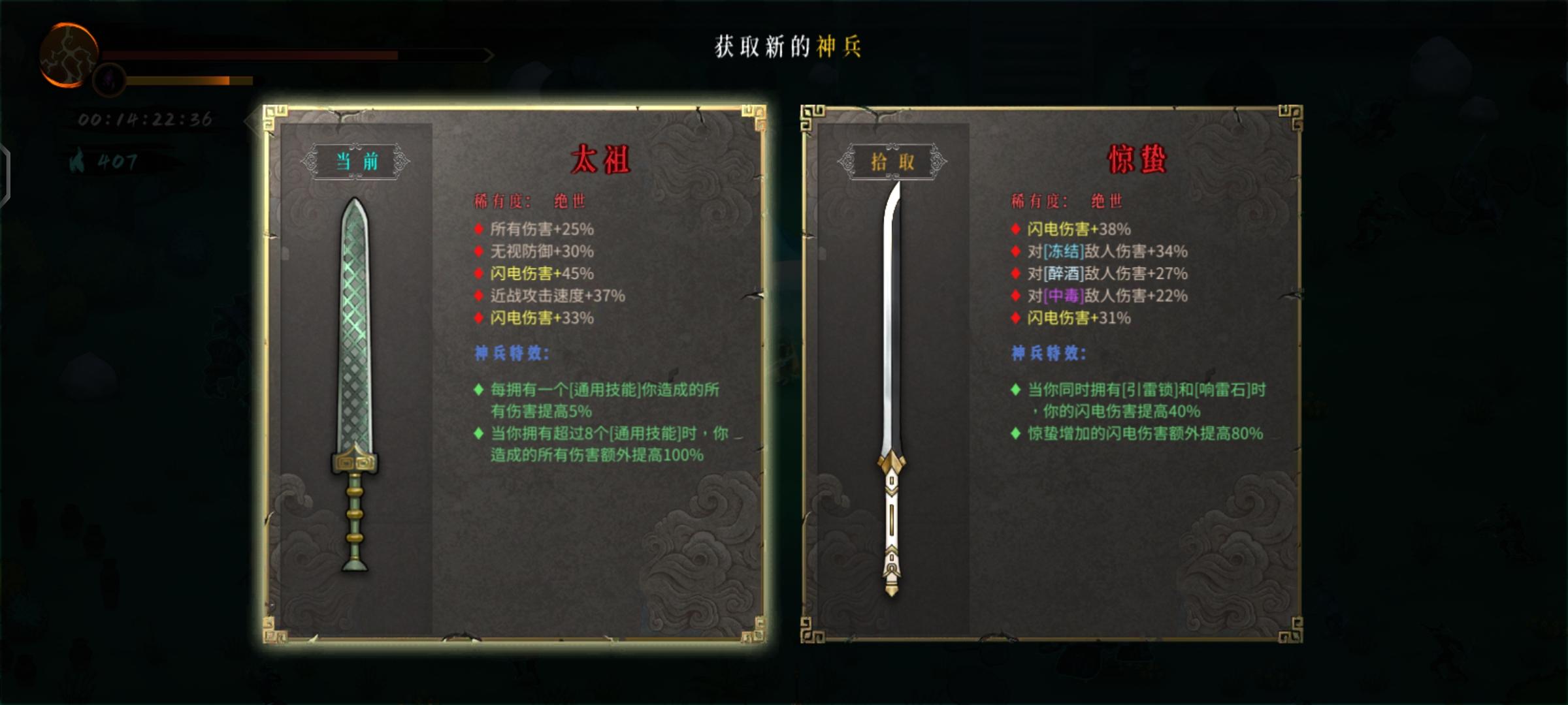 玩个雷,开局斩龙然后拿走火,然后一直到最后一章都没见到斩龙,都是这些玩意,一把其他的武器都没见到,脆的要死还没有伤害,一个自爆兵直接给我炸满血,这一套下来一个收剑全屏闪电一下子能秒一个我普攻都秒不了一个怪,斩了个寂寞