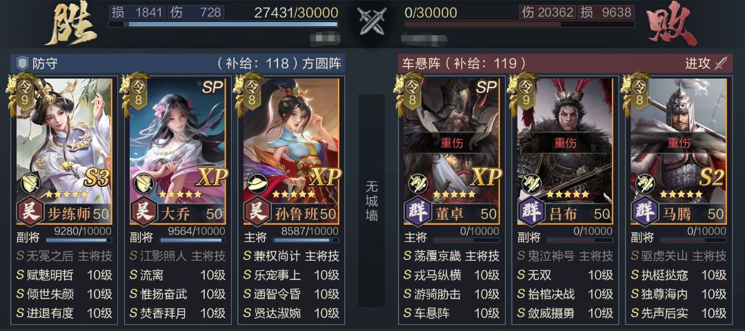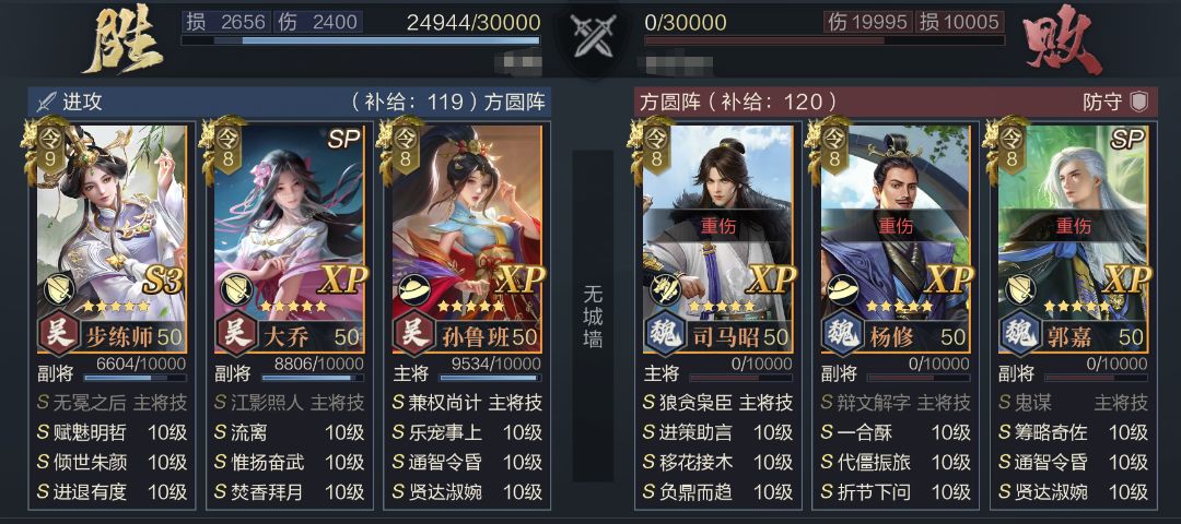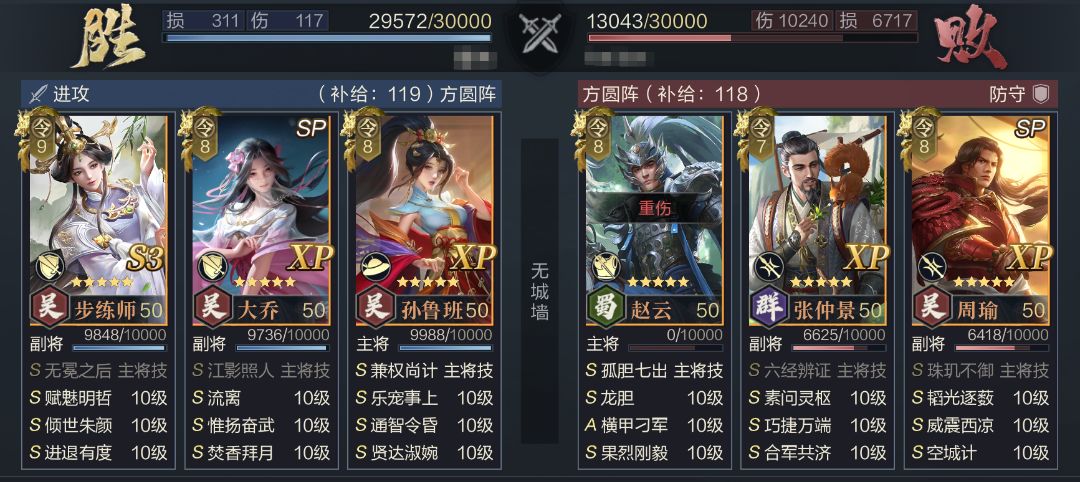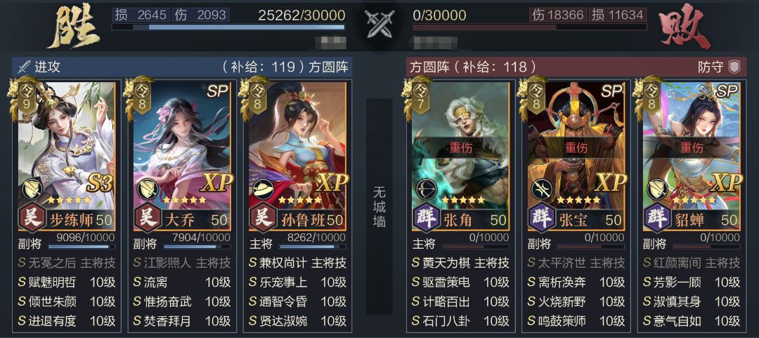 通过实战测试可以看到,新吴步虽然放弃了神算带来的超高爆发,但队伍本身输出能力并没有出现下降,反而通过替换坦度更高的SP大乔将队伍战损进一步减少。并且队伍调整空间较大,步练师配置的两个武技都可以进行替换,更方便适应多种类型的队伍。