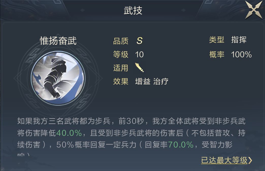 SP大乔作为纯粹的前排承伤工具人替队伍搭配三步武技即可,固定惟扬奋武+焚香拜月,实战根据与步练师的智力高低对换武技(尽量保证智力最高者使用三步+焚香)。
