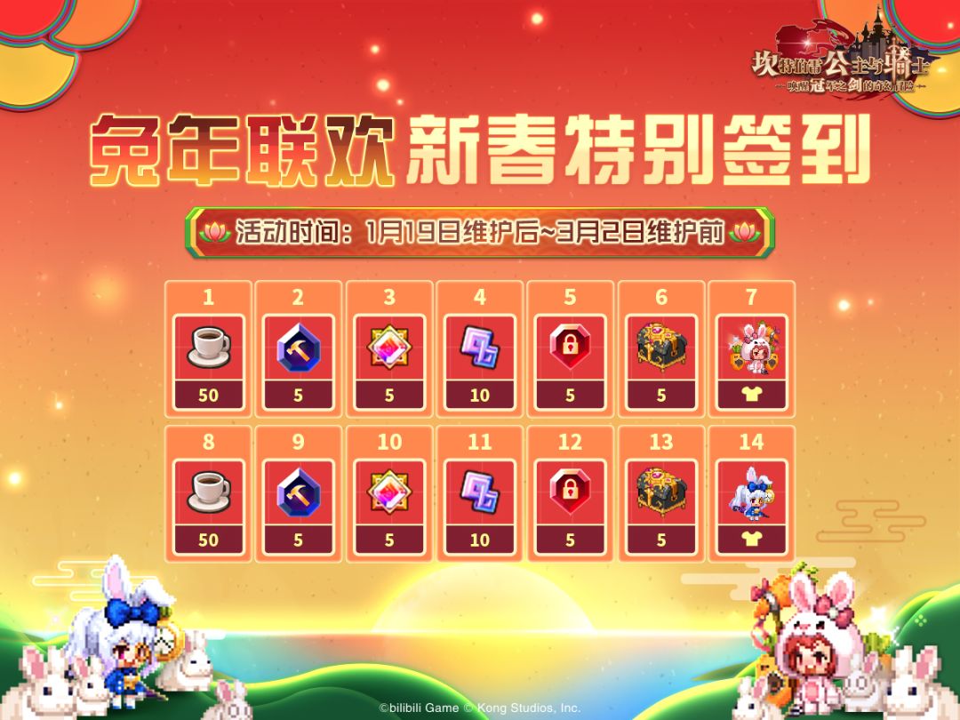 为感谢各位守护者的支持,《坎公骑冠剑》将于2023年1月19日维护后开启【兔年联欢 新春特别签到】。累计签到14天,可获得兔年特别版英雄时装等超多奖励!
