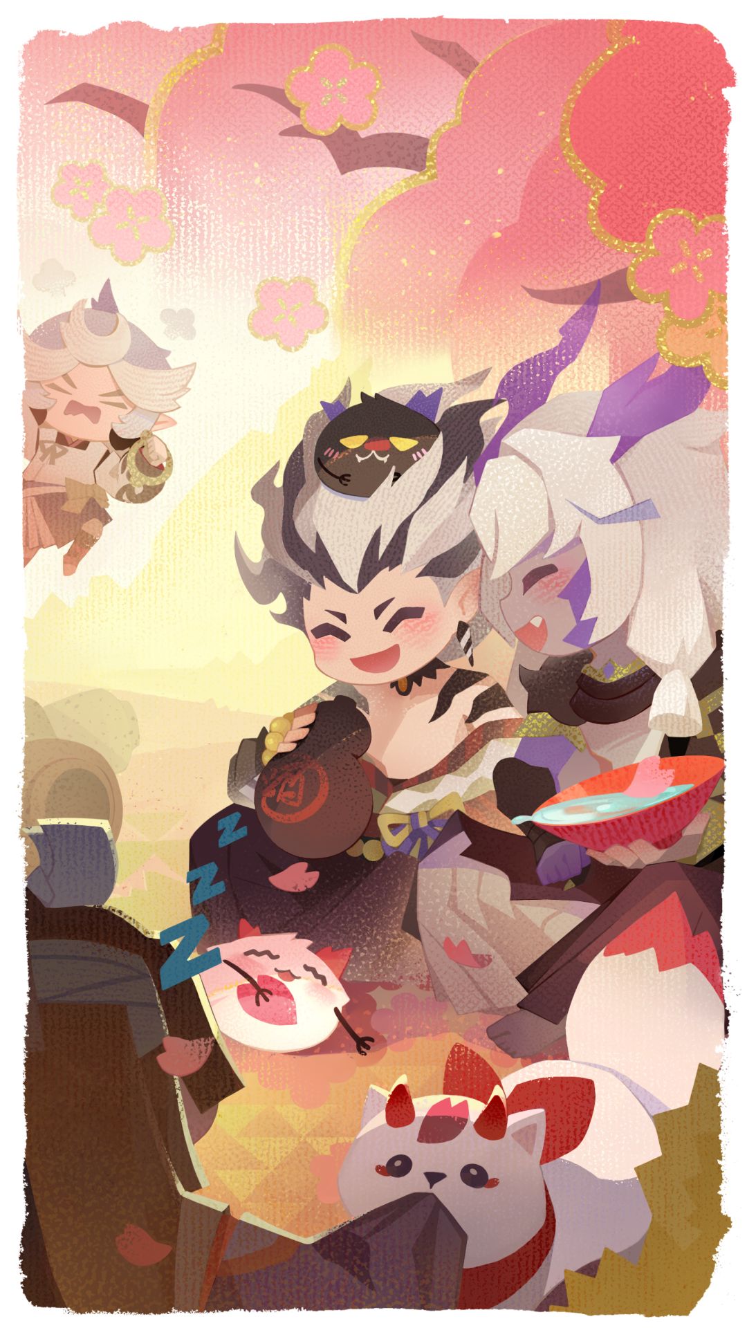 「除了你们,未成年的小家伙不得私自饮酒。」正在偷喝碗中酒水的茨球被本大爷拂去一旁,那小家伙不胜酒力,很快便像鬼切一般酩酊大醉。