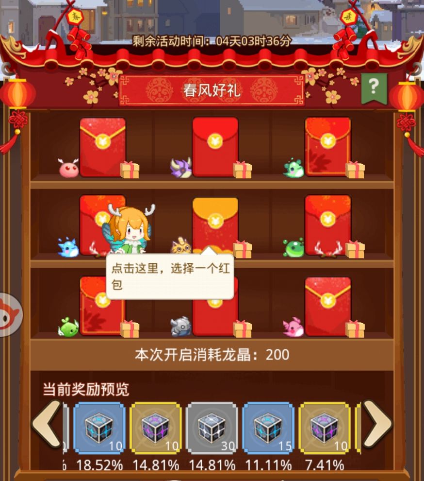活动期间,玩家通过消耗一定数量龙晶开启红包,每轮最多抽奖9次,最多开启6轮,每轮红包都设有一个大奖,获取大奖后可直接进入下一轮!