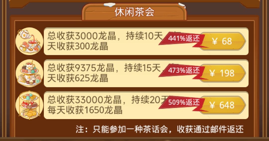 活动期间,勇者可以购参与茶话会,购买后可每日获得高额龙晶返利!