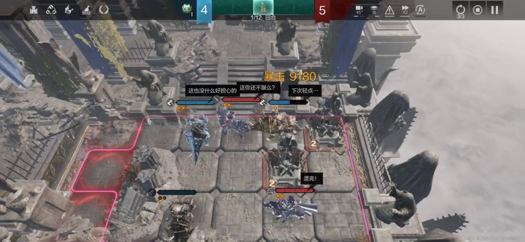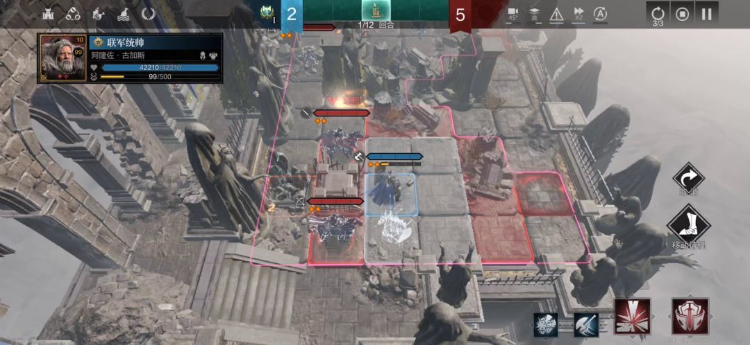 (4)第三回合右上角生成的单位如果是游骑兵等远程输出单位就回溯,剩下的堡垒走开,不要挡住右上角新生成的近战兵的路,送了也没关系,卡位最后一步也完成了。