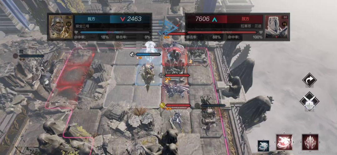 注意点:(1)以45度视角观看,下方因为弓舞者两个单点技能都是近战,还会概率施加“割裂”状态,会让我方单位每回合开始持续掉血,很容易到后面扛不住流血死亡,对我们人物练度要求较高,所以我把大佬的视频中使用到的飓风狼骑和统帅的初始站位互换一下,让统帅来单抗弓舞者的持续输出,降低练度要求。统帅第一回合走2格,第二回合走2格来到目标点下方一格。第三回合开始就一直挂机在原地不动了,统帅千万不要站到目标点上面,因为是狂战士先动,弓舞者后动,这样狂战士会直接走到统帅面前,一回合统帅就要承受狂战士和弓舞者的输出,这种情况我们是不能接受的。