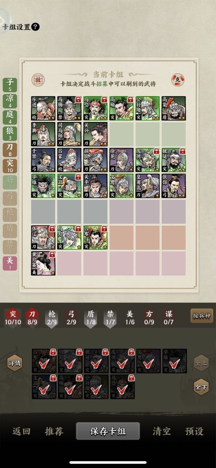 前期靠三刀三突,6人口换马超组凉羁绊,陆续撤刀,10多关过程可能会被晕卡关,需要多打几次,9人口换吕布或者张辽组狼羁绊(优先吕布),后面就好打了,最后有个玉玺宝物可以给魏延