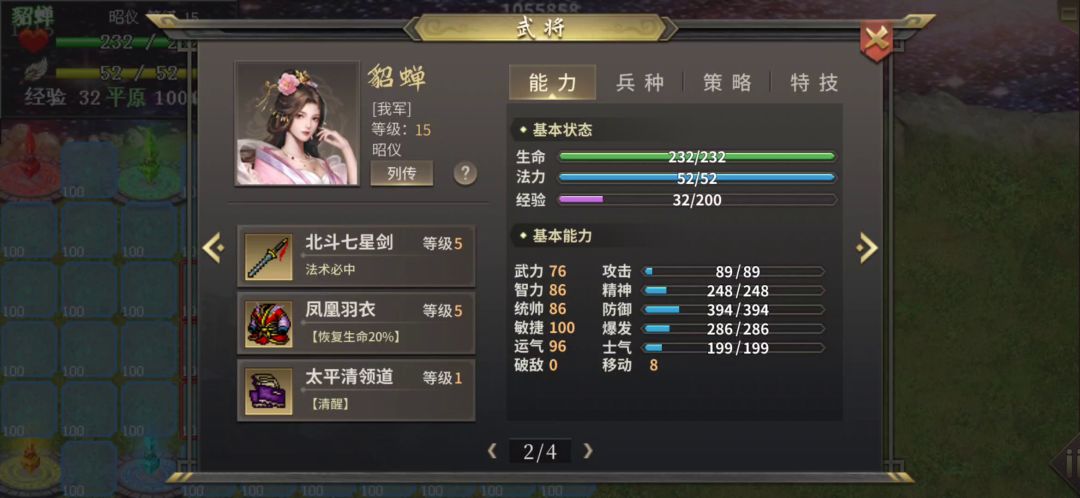 3.所有特技和果子(除了加士气的)都给吕布吃(无需老白的先制,双杀,或者其他关键的必中等)。貂蝉需要一阶皮肤,带北斗七星剑(没有的话真七星剑也行,就是魅惑可能需要适当的s/l),凤凰羽衣(1000分以上时忍者打她都会触发25%原力护盾,所以防御和血量基本没用),太平清领道。