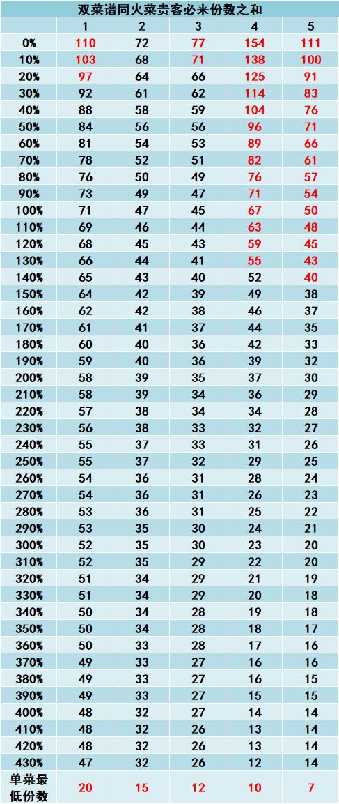 直接上结论吧,如果是遇到了多次同贵客的任务,如下图,用时间相对快一点的菜去做,一个菜不能必来的情况下,一二三火的单菜拉满就行,四五火的单菜最低份数,做到n-1/n时,最后一次贵客用双菜凑必来,效率最大化。