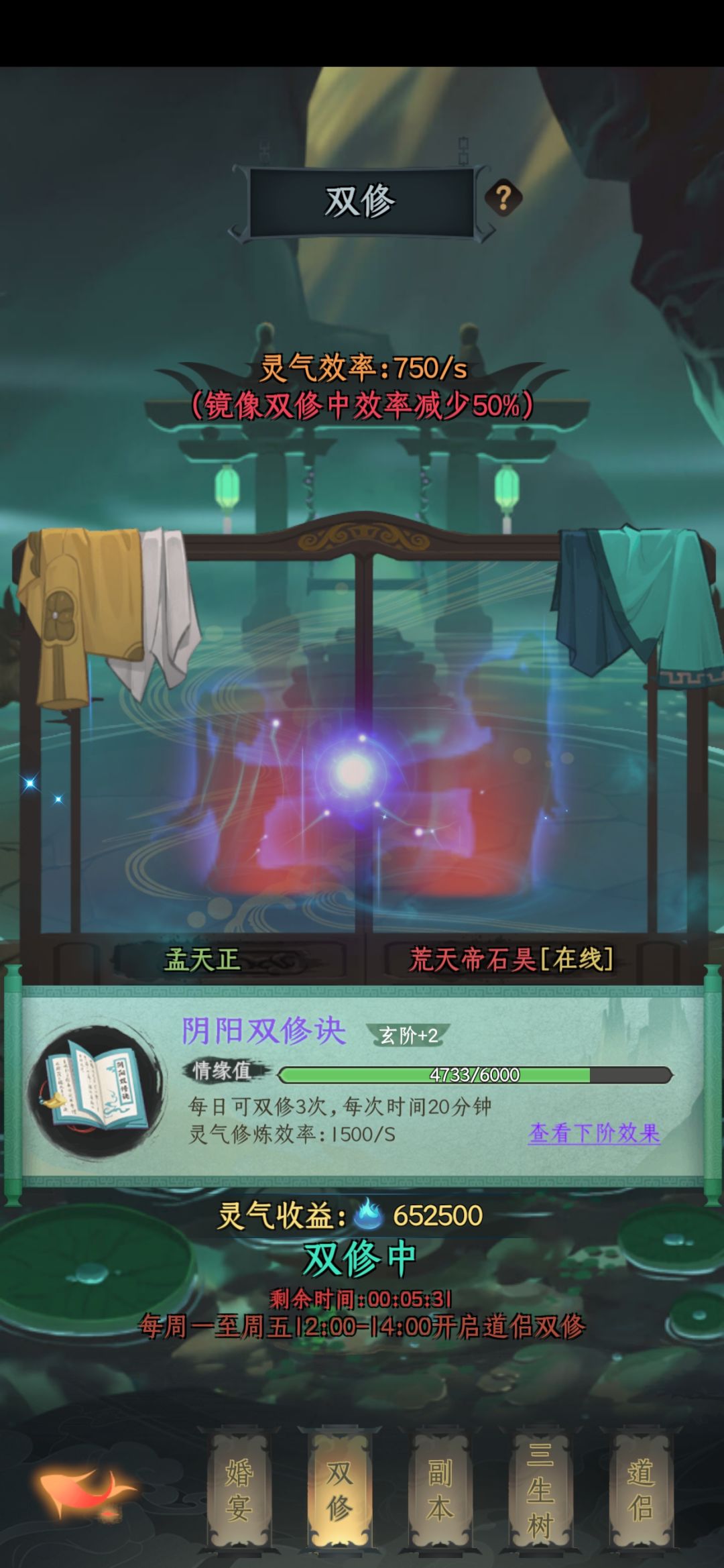 4、道侣系统:周一到周五每天中午12点开启双修功法,获得灵气。周六周日参加婚宴获取6次食品,食品最高的是大盘鸡,比当前境界的极阶丹药所增加的灵气还要略高一些。推荐。(先参加别人5次婚宴,然后自己再开启婚宴就可以获得6次,人多的区,大家分配好开启婚宴的时间点,一般相差8分钟左右足够点满贺礼,获得大盘鸡。人少的区可以和朋友们商量好每人建立个小号,然后让小号开始婚宴,用玉补满贺礼,大家吃鸡)