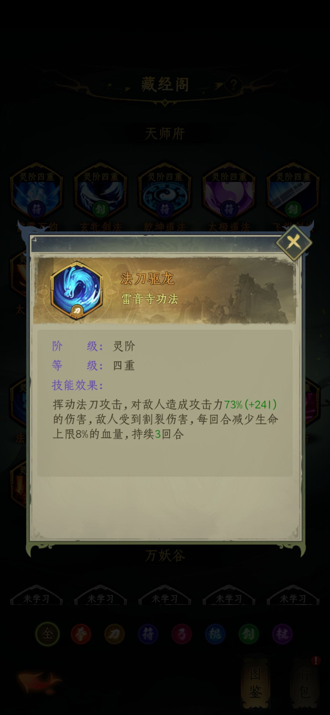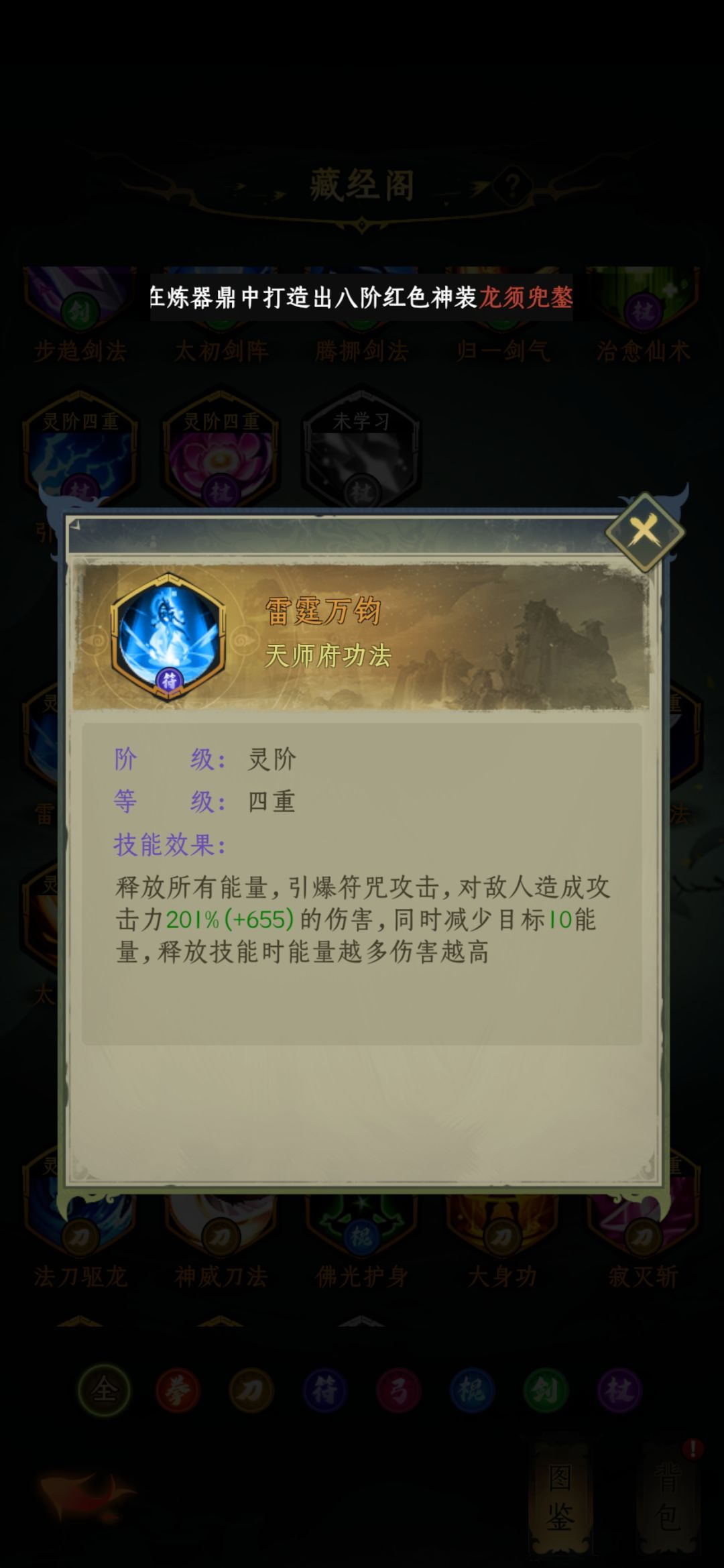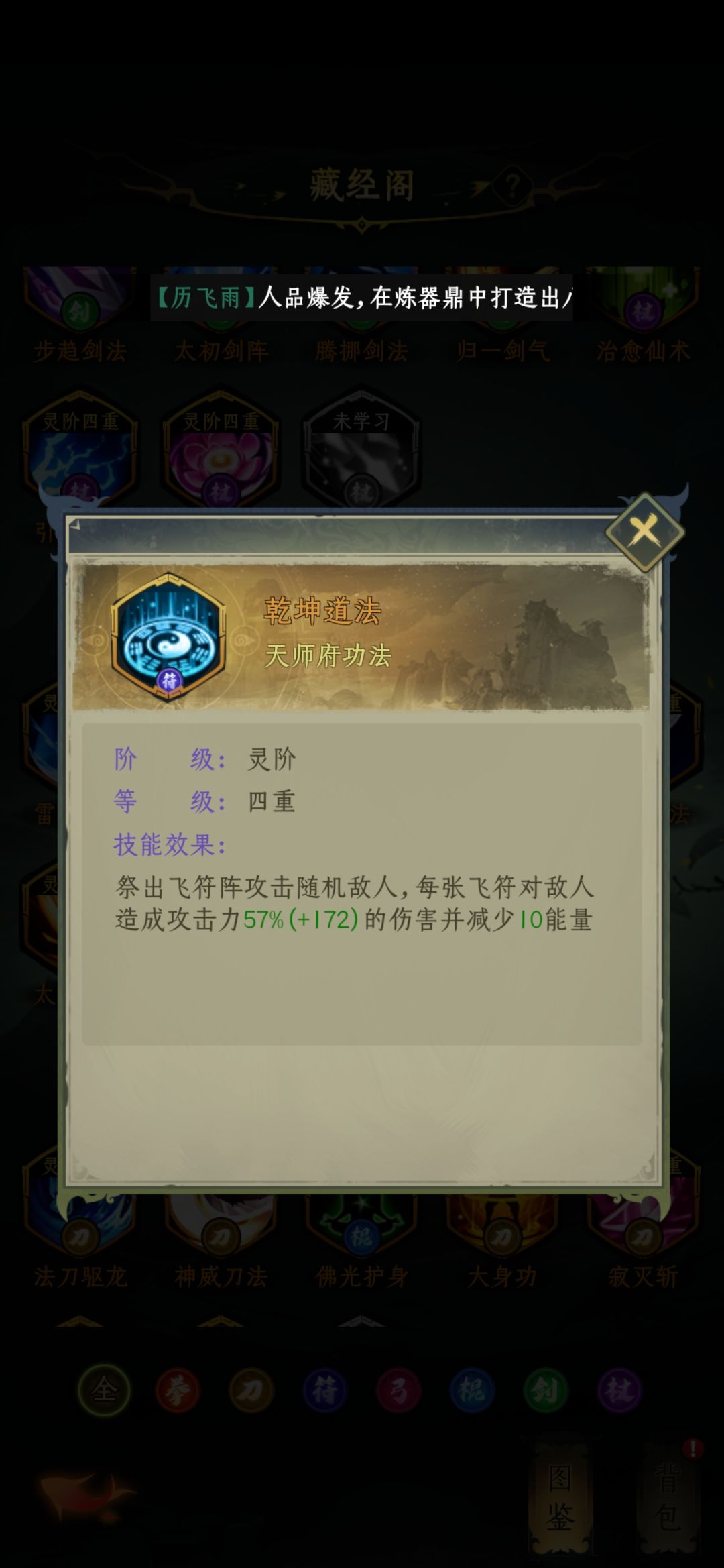 天师府技能介绍完毕,推荐乾坤、雷霆万钧、玄牝剑法,其余备用