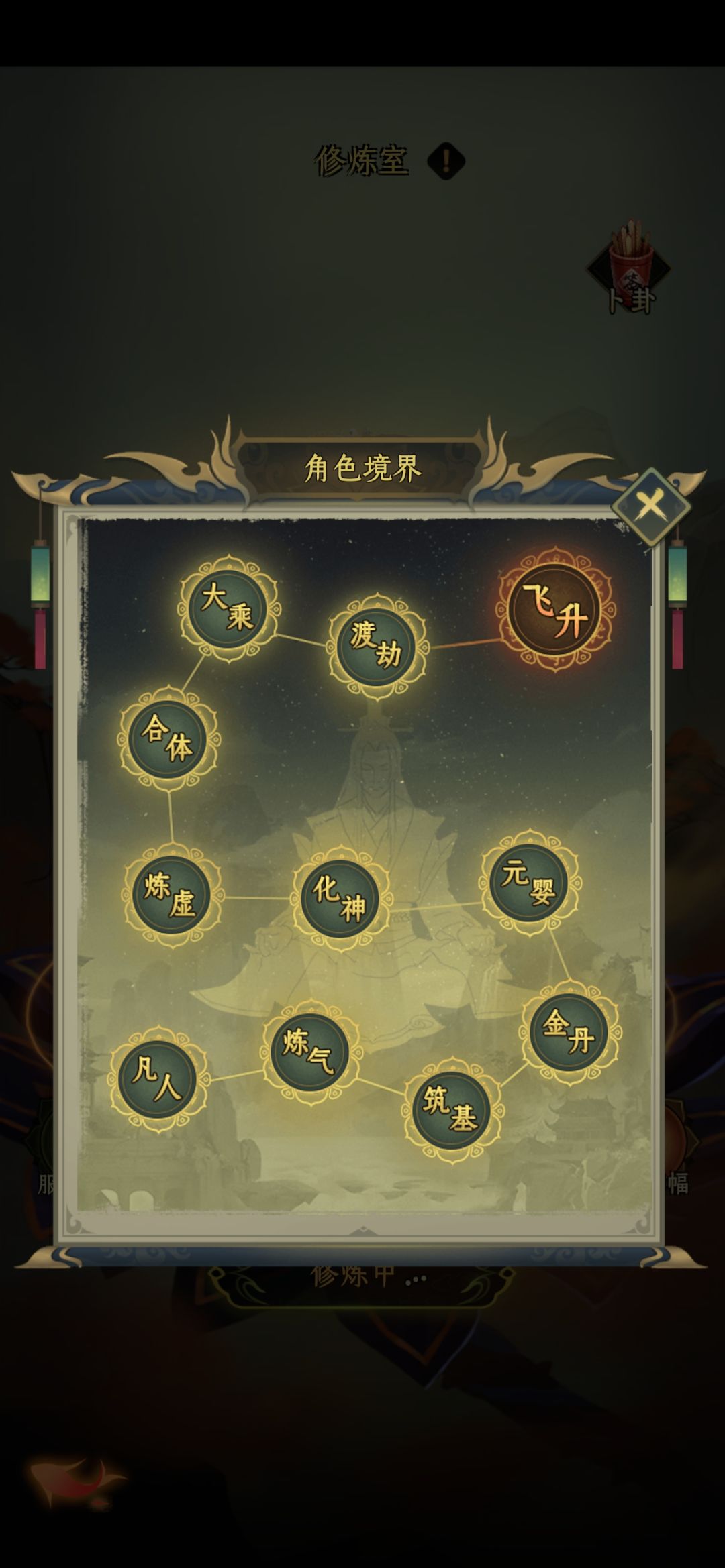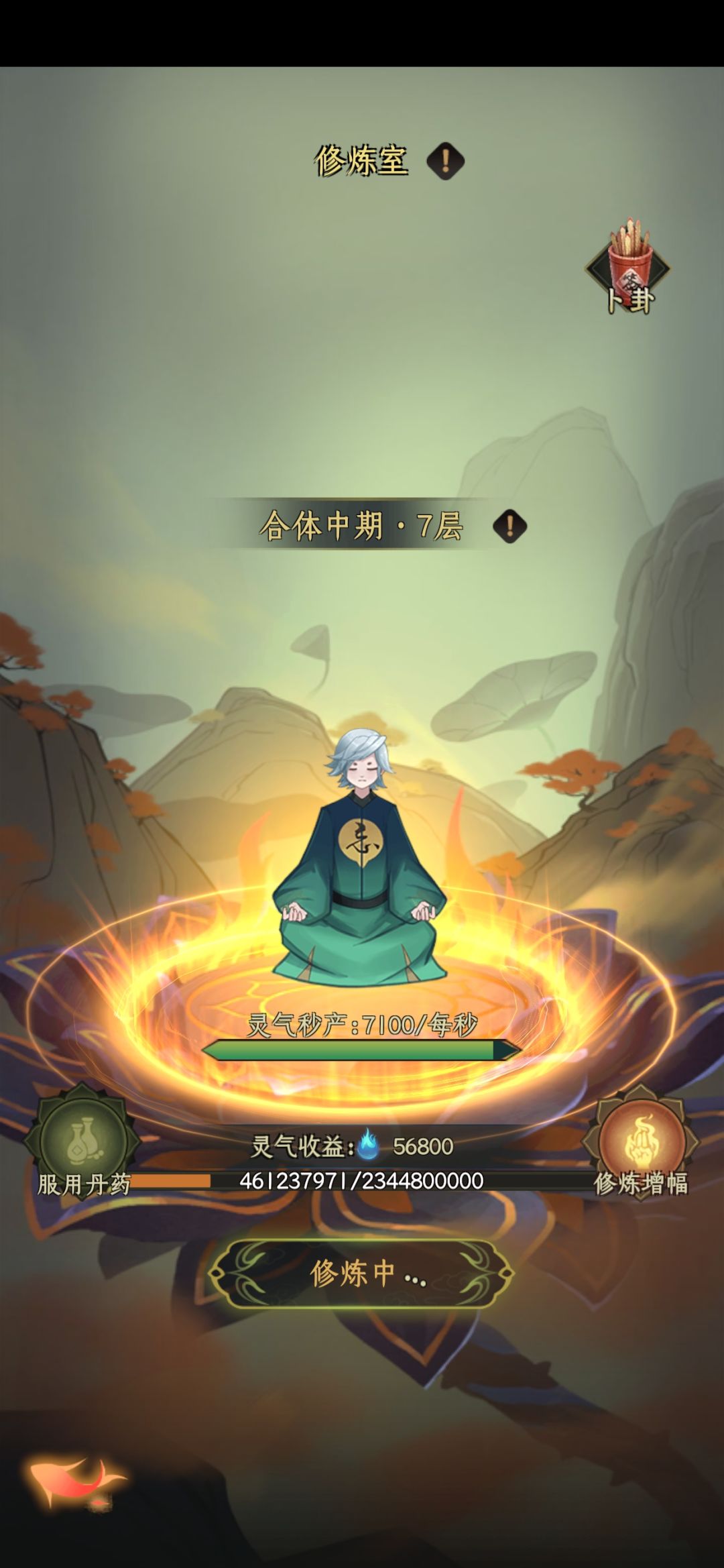 3修练室:打坐修炼的地方,24小时不间断提供灵气来源,每秒获得的灵气随着小境界的增长而增长。一天有一次12小时的卜卦百分比加成,50%是每天必点多,一般中午11点58分点击卜卦最佳,高境界后除外。而外还有每次渡劫后激活的星盘,优先点满修炼。