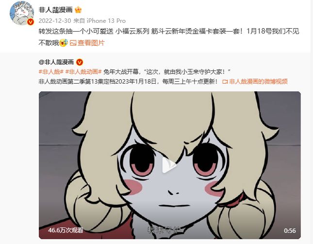 2023年1月18日非人哉复播后,每周三上午10:00更新!战斗家们记得去看噢!