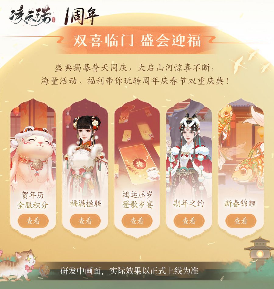 《凌云诺》游戏公测一周年与传统新春佳节在机缘巧合下相会,为了纪念这个特殊的时刻,本次双庆盛典在准备了沉浸感十足的邀约体验玩法同时,大启山河上下齐心,为君卿们献上了丰厚庆典豪礼。