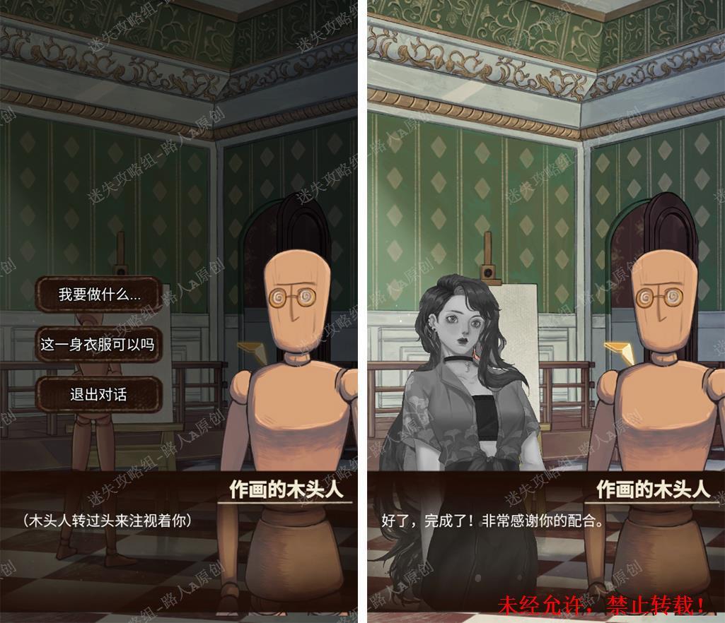 55.和木头人对话,完成画作。(确保物品栏有正确服饰:网纱礼帽、紫色晚礼服、黑色高跟鞋、绿宝石项链。)55.1