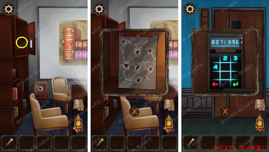 64.玻璃屏幕的孔洞位置对应密码锁的缺失数字,再结合书本的裂纹线索,得到密码【8071596】,解锁治疗室。64.1、64.2