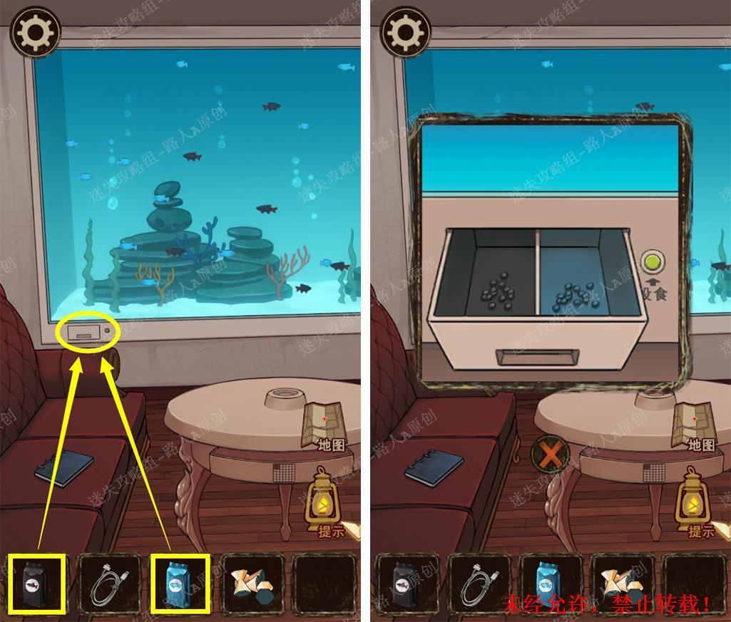 70.将2种【饲料】放入鱼缸的饲料槽(需要饲料包装和槽位颜色一致),点击【投食】按钮。70.1