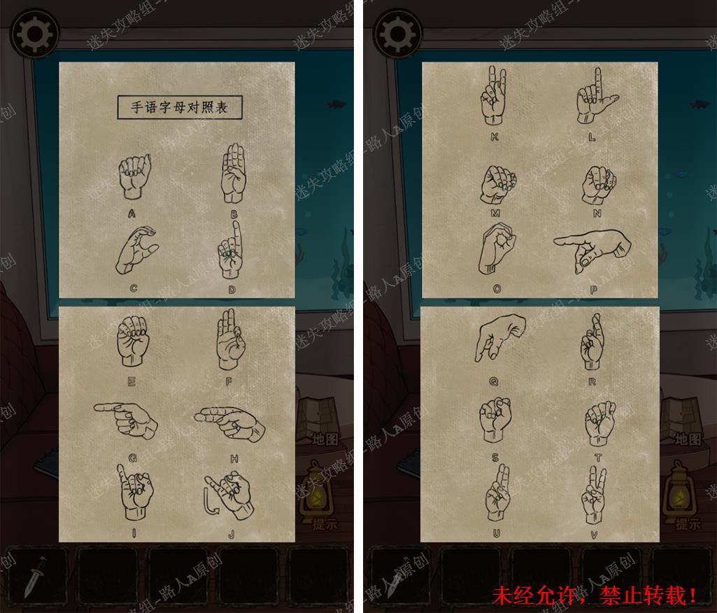 76.根据投影的人物手势和笔记本的手语对照表,用【小刀】割开地毯,输入密码【FLUED】打开地上的密码锁,取得【星空灯】。76.1、76.2、76.3