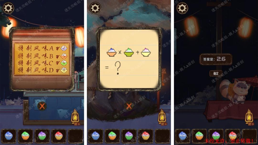 ① 谜题纸条上的图案:【蓝刨冰】和【橙碗】、【绿刨冰】和【绿碗】、【红刨冰】和【黄碗】