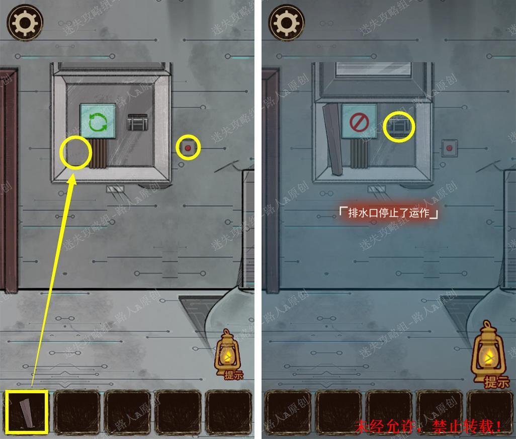 105.点击按钮打开盖子,用【长条木块】阻挡盖子滑落,拉下闸门关闭排水口。105.1