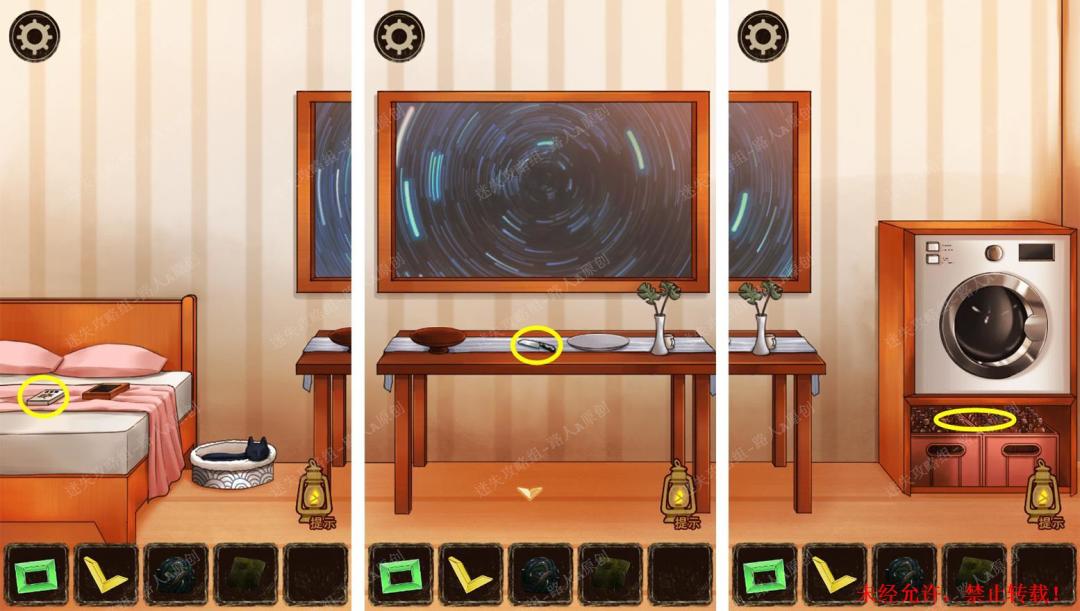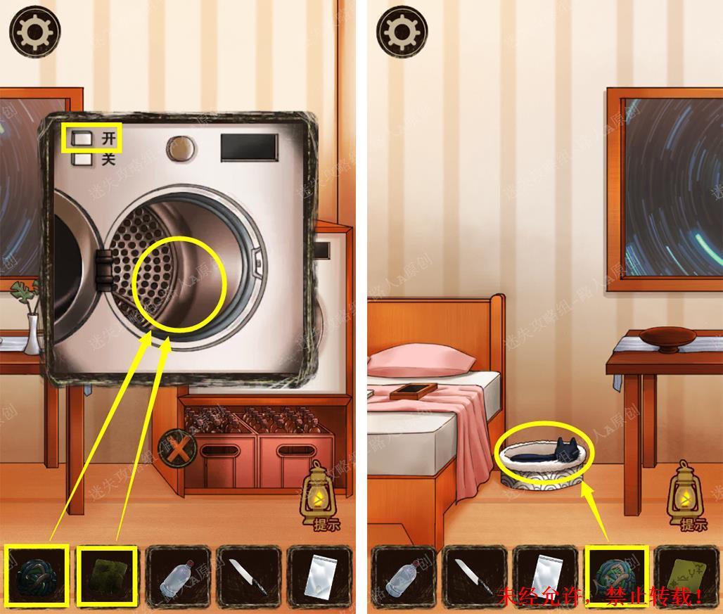 114.将【毛球】和【布条】放入洗衣机清洗,将【干净的毛球】给猫咪,取得猫窝里的【钥匙】。114.1