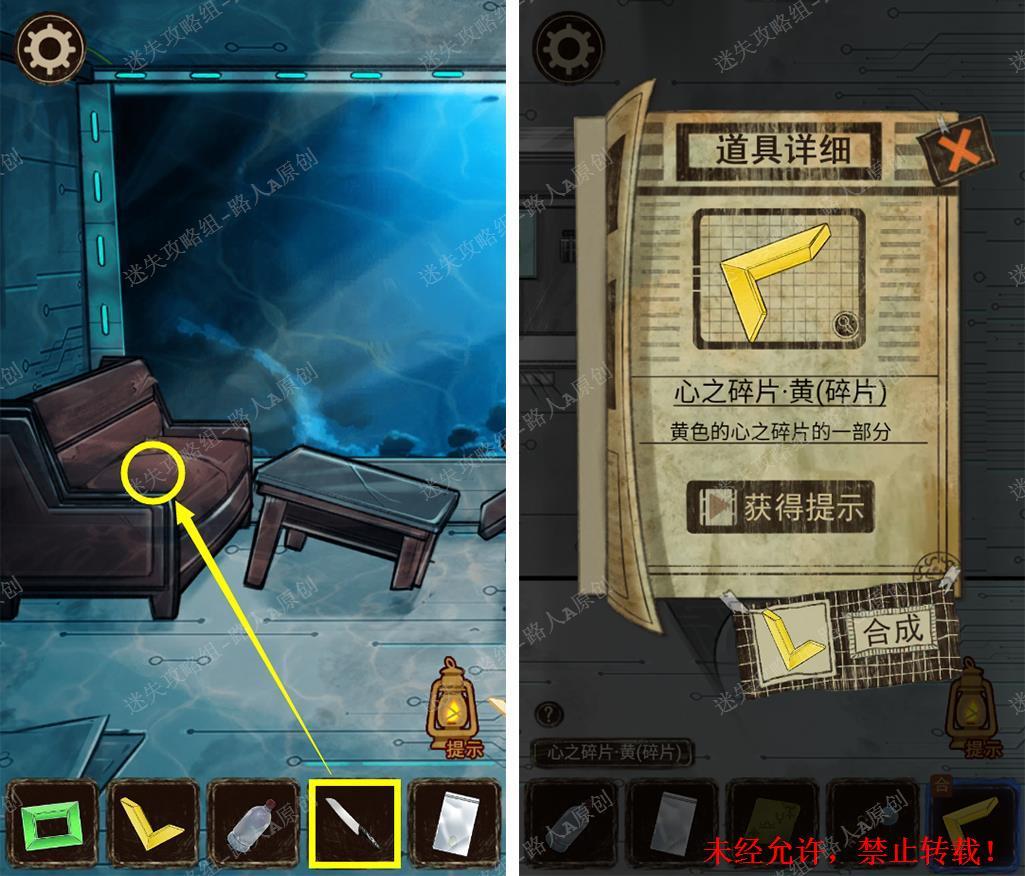 115.前往3楼观景台,用【水果刀】割开沙发,取得【心之碎片·黄】。组合2个【心之碎片·黄】。115.1