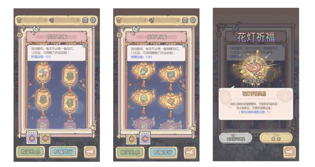 3、花灯的祈福奖励,可通过消耗黑蝌蚪(限5次),或者通过蜡烛刷新;锦鲤花灯的祈福奖励,可通过消耗白蝌蚪(限5次),或者通过锦鲤蜡烛刷新;