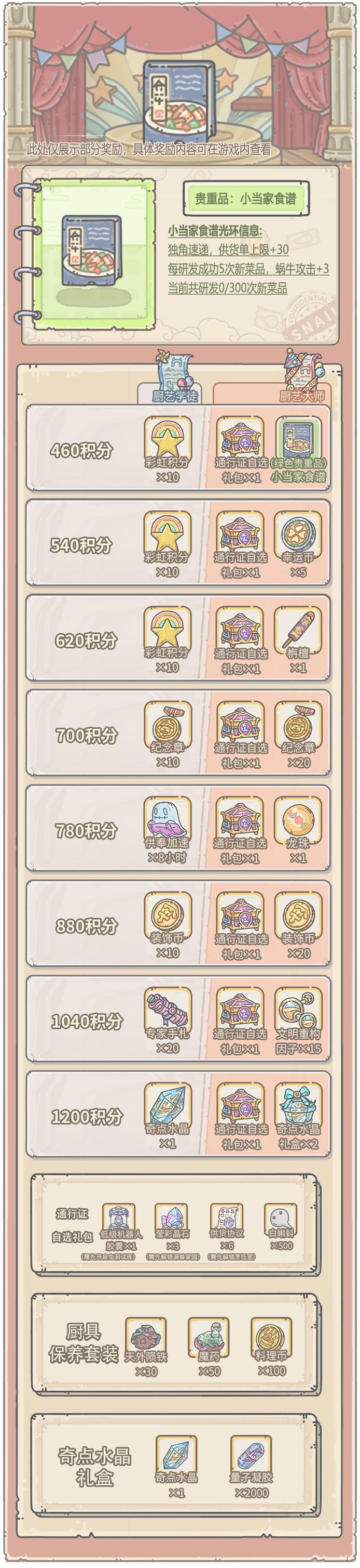 11、角色总等级48级后,开启通行证厨神传承每1级角色等级,获得10积分,累积积分可领取厨艺学徒奖励,升级厨艺大师可解锁更多奖励!
