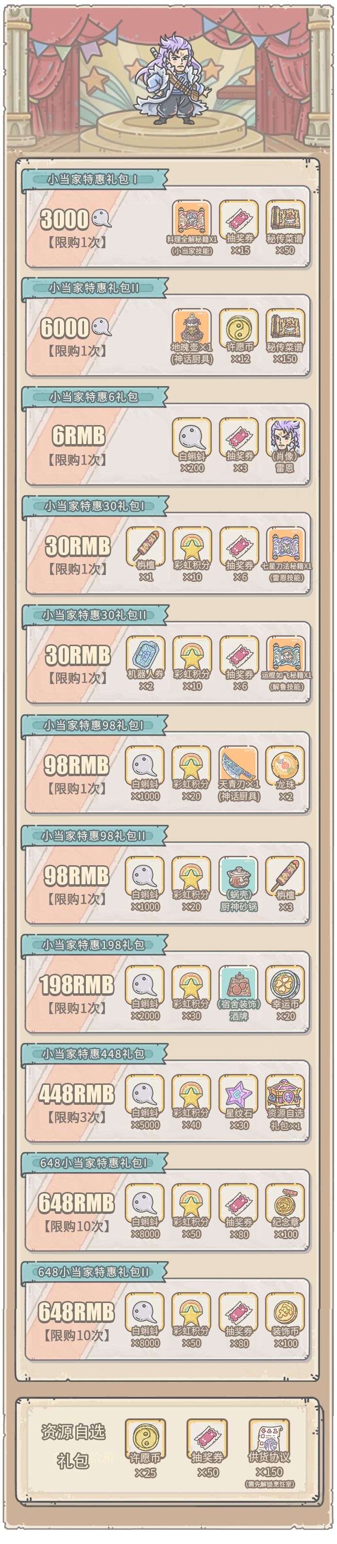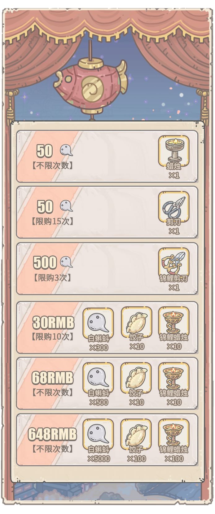 30、68、648元锦鲤蜡烛礼包:任一锦鲤花灯的白蝌蚪刷新次数用完后,可在礼包列表中出现并购买;