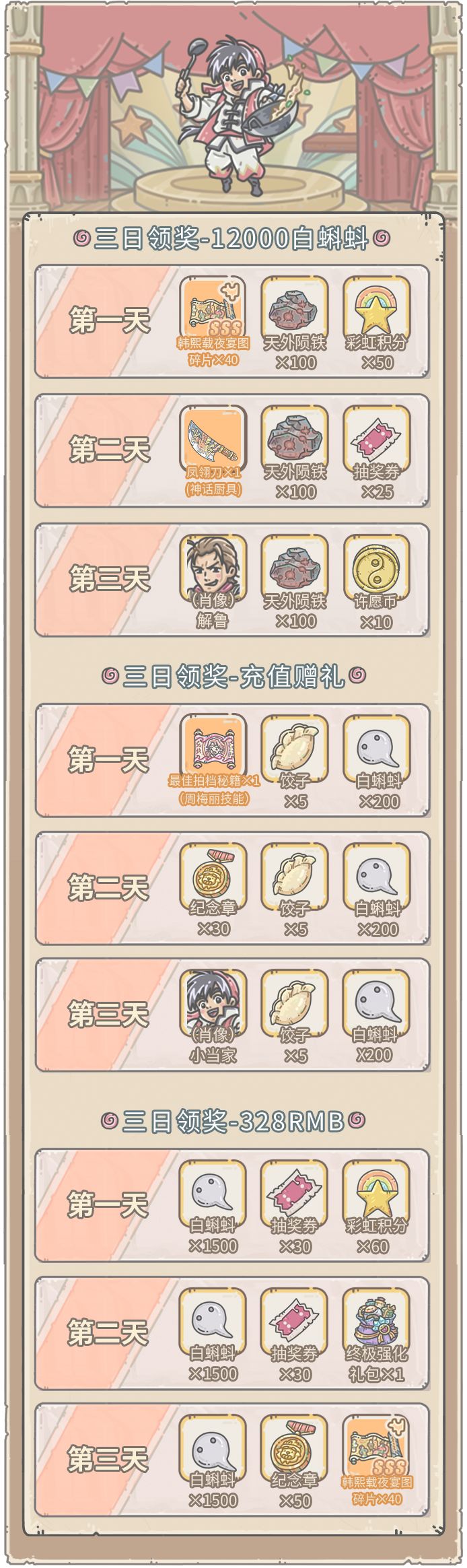 3、活动开始后3天内,每天依次开放一栏赠礼奖励,第3天及之后购买可直接领取全部3天贺礼奖励