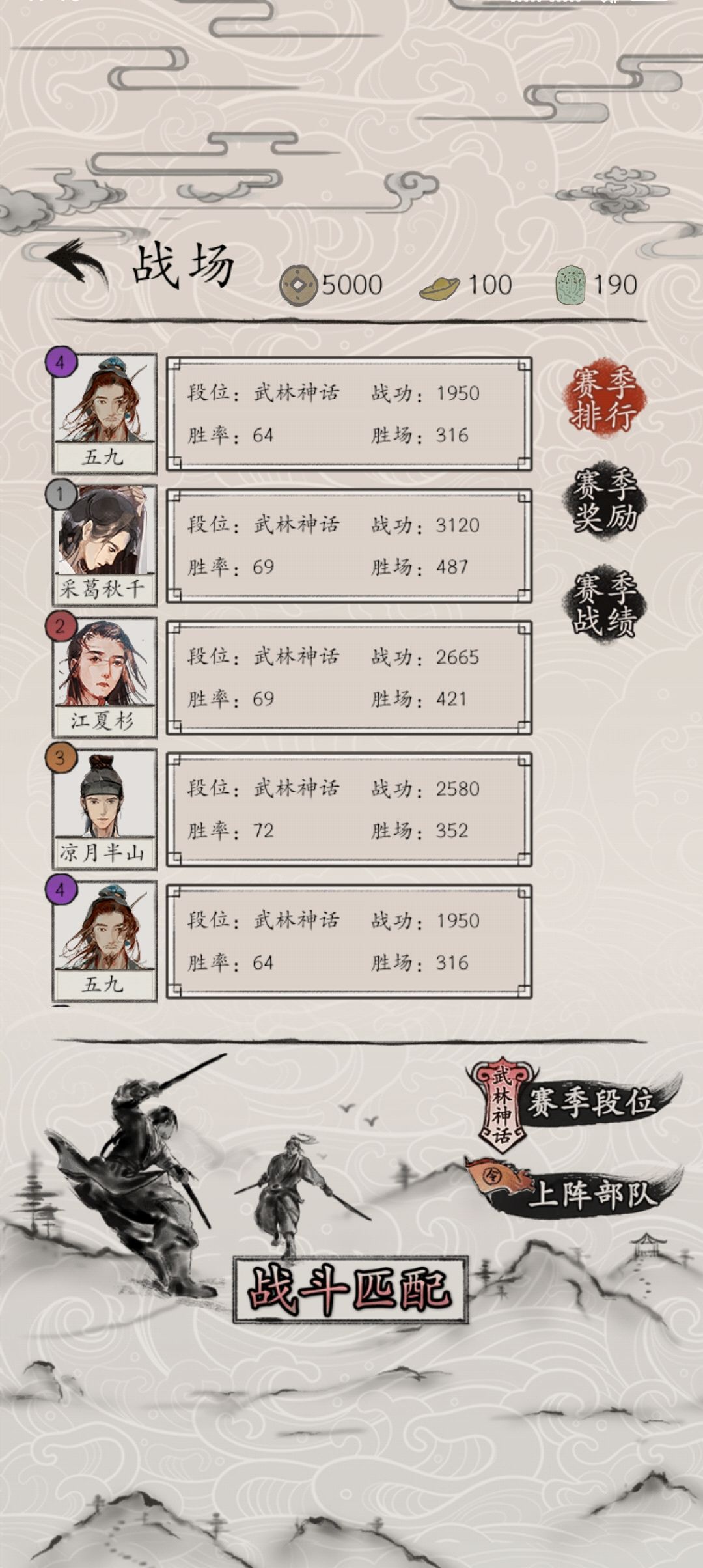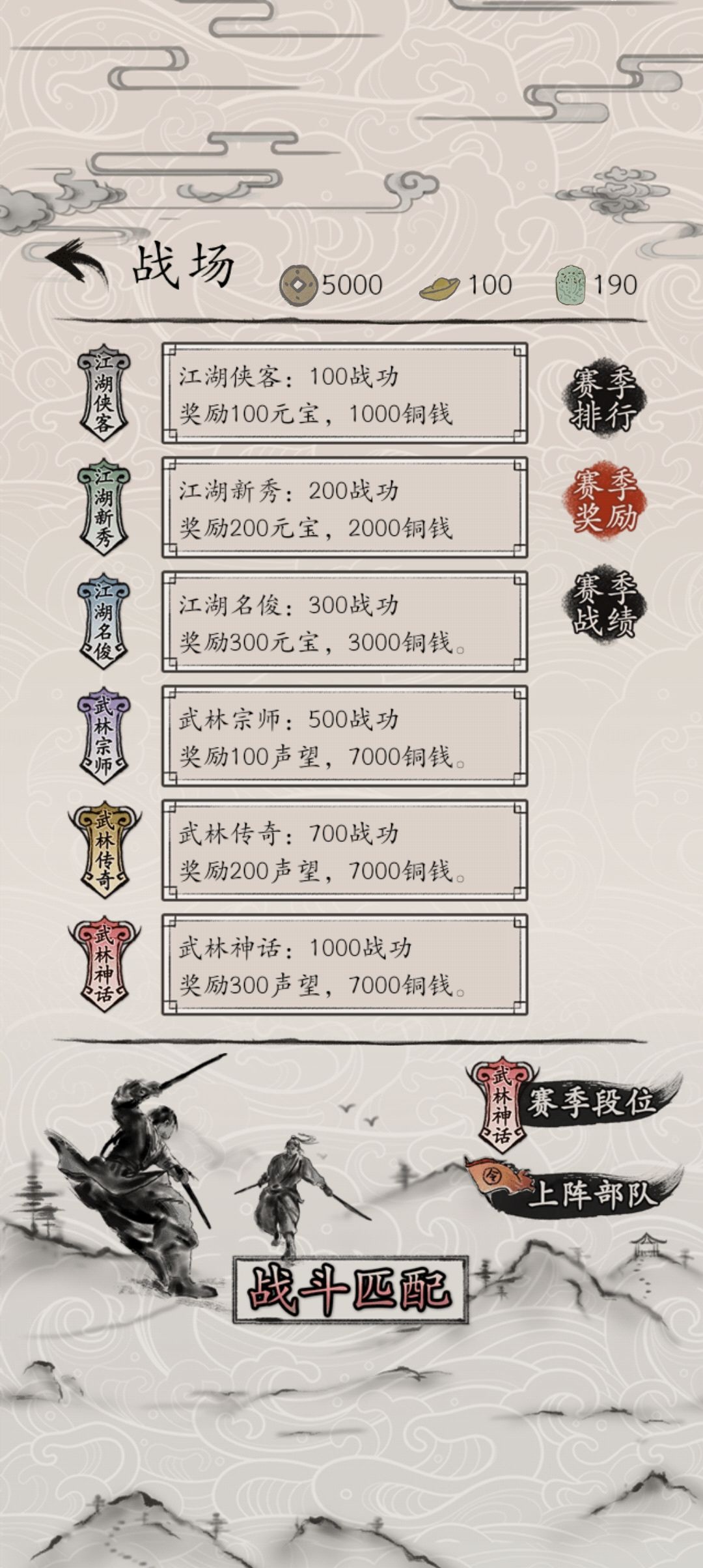 战场,可以和他人对战提升技术,胜利一场可得1000铜钱。
