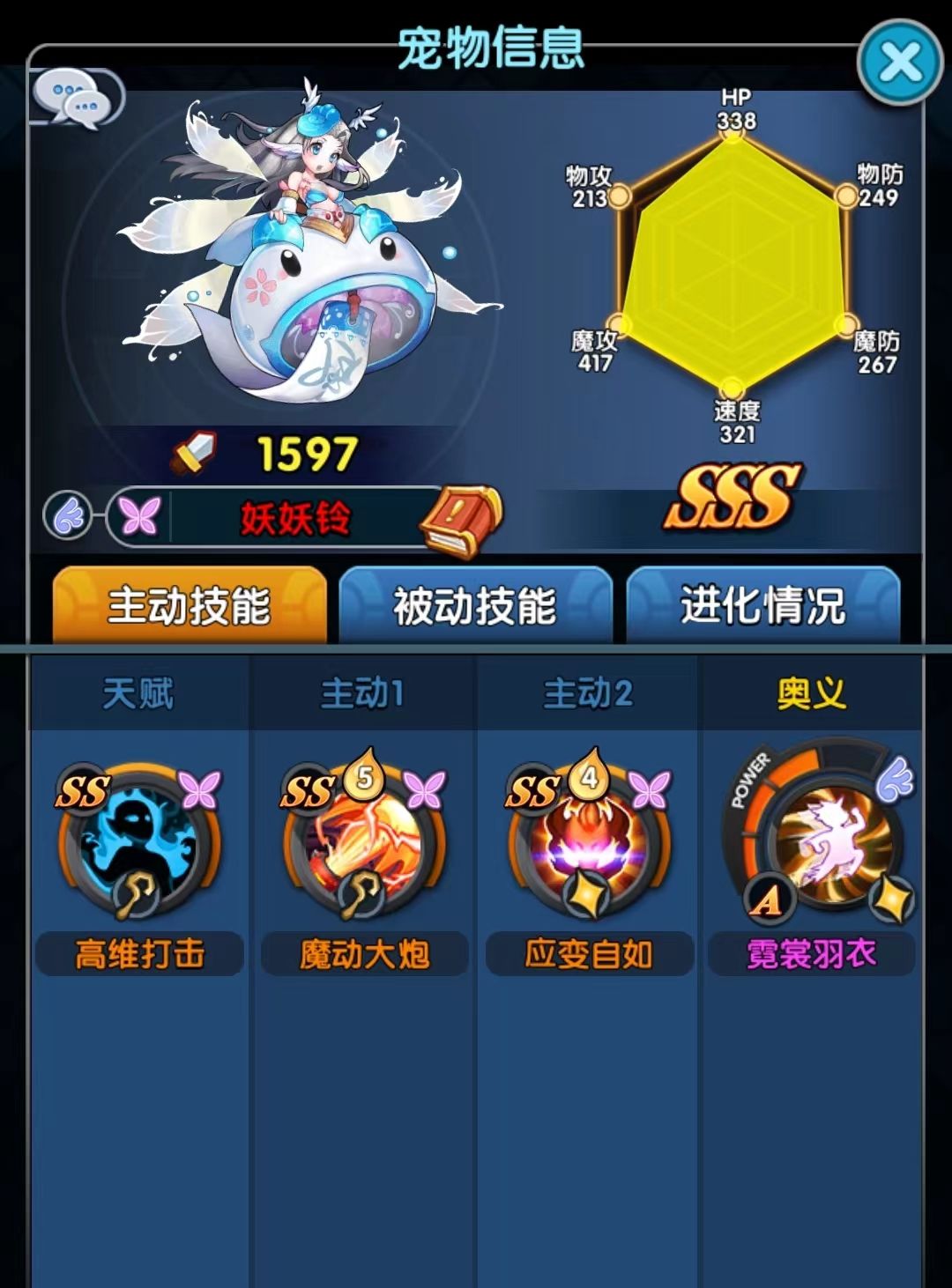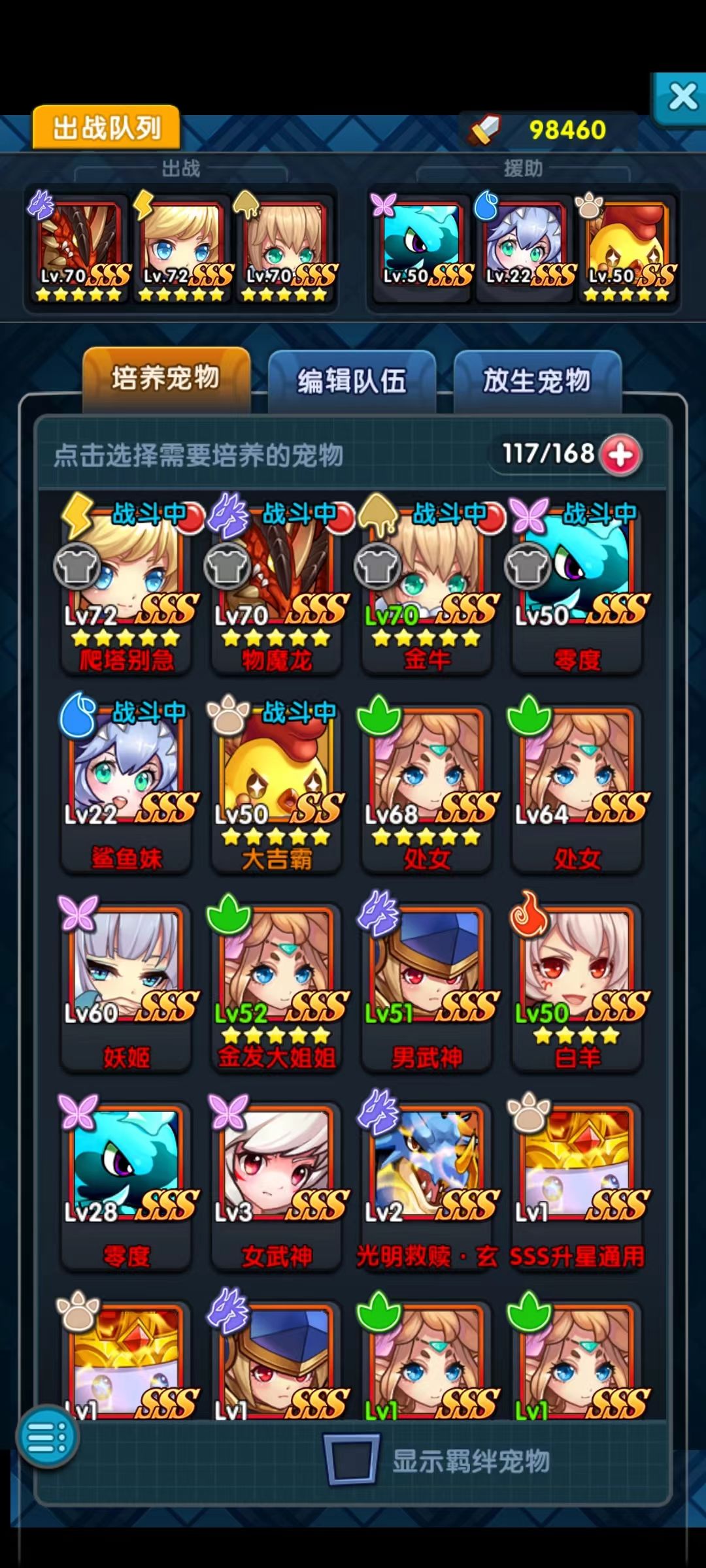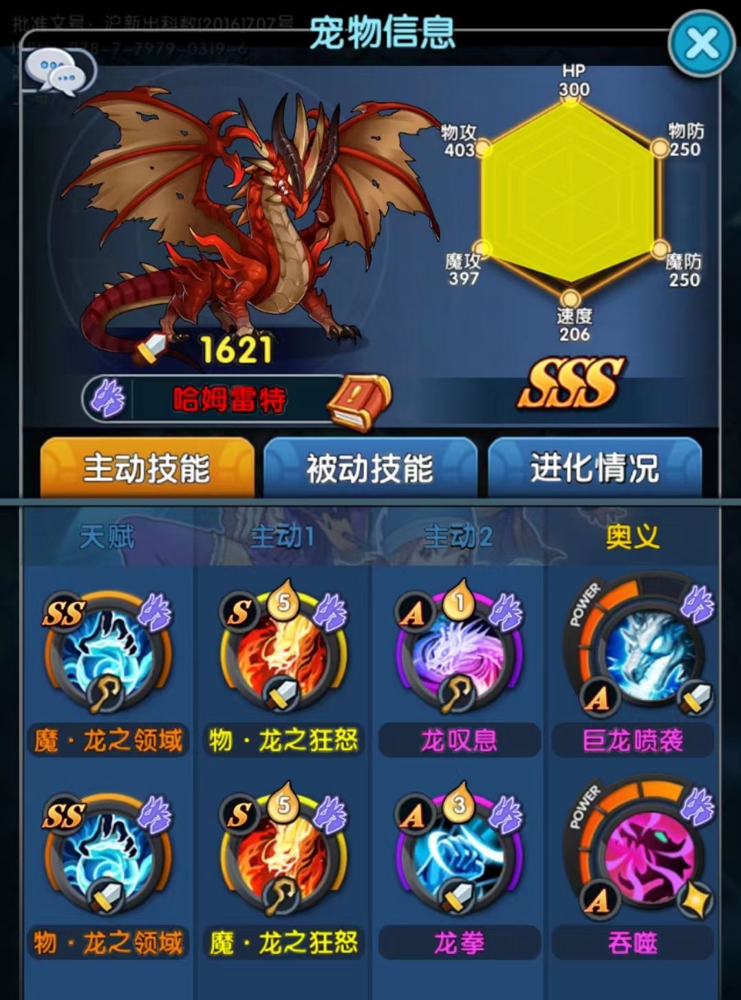 (这里插一句什么是宠物升星:游戏里面的进化有两种方式,一种是等级进化,一种是玄进化,其中玄进化更为的强力,而玄进化的要求之一就是宠物满五星。宠物升星需要吞噬同类或者SSS通用,许多宠物可以在迷失之塔里面捕捉,但是部分稀有强力宠物无法通过捕捉获得,SSS通用升星材料也可以用来顶替任意SSS升星)
