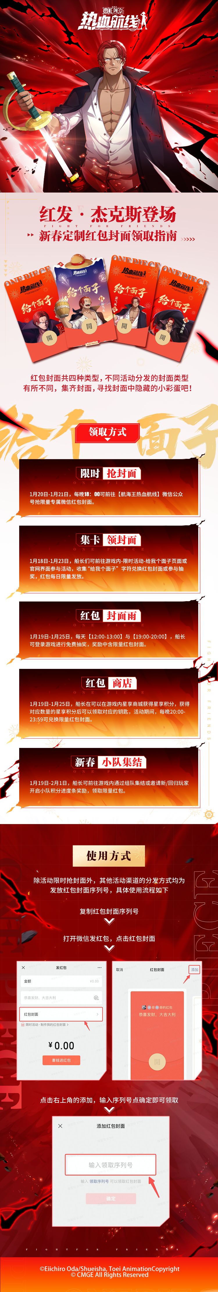 新春热血祝福,红发震撼登场!来热血航线给红发个面子,领取定制微信红包封面带你承接红发霸气,新春佳节红红火火,鸿运当头!