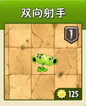 双向射手:感觉这个射手就是为了克制淘金僵尸而生的,双向射手顾名思义就是可以向前后两个方向发射豌豆,属于豌豆家族的。发射速度:向前发射正常速度,向后发射速度是向前发射的2倍。植物语录:前面的头说“轮到我用眉毛了!”后面的头说:那只好一人一半了。虽然出生就差2分钟,可眉毛争夺战的硝烟永难停息。也是比较有区的植物呢。